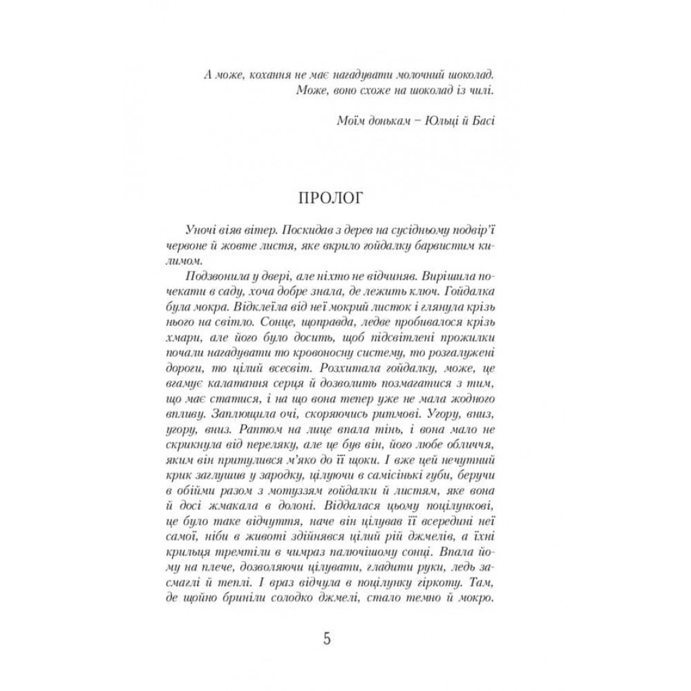 Вам доводилося куштувати шоколад із чилі, де солодкий смак поєднується з гіркотою? Саме його нагадує життя 17-річної Лінки, яка щойно вступила до омріяного ліцею. Вона відшукала давно втрачену сестру й нарешті розібралася у своїх почуттях до Адріана. Здається, перед нею чудове майбутнє. Проте не все так рожево. На навчання Лінці доведеться заробляти, мама не в стані сплатити за дорогий приватний ліцей, стосунки із сестрою теж не завжди ідеальні. Крім того, коханий їде навчатися до Лондона, а це означає кількамісячну розлуку. Лінка живе в очікування Різдва, бо тоді Адріан має приїхати до Польщі. Проте на неї чекає неприємний сюрприз. Що ж, може, кохання не завжди мусить бути солодким, як молочний шоколад? Може, воно нагадує шоколад із чилі?