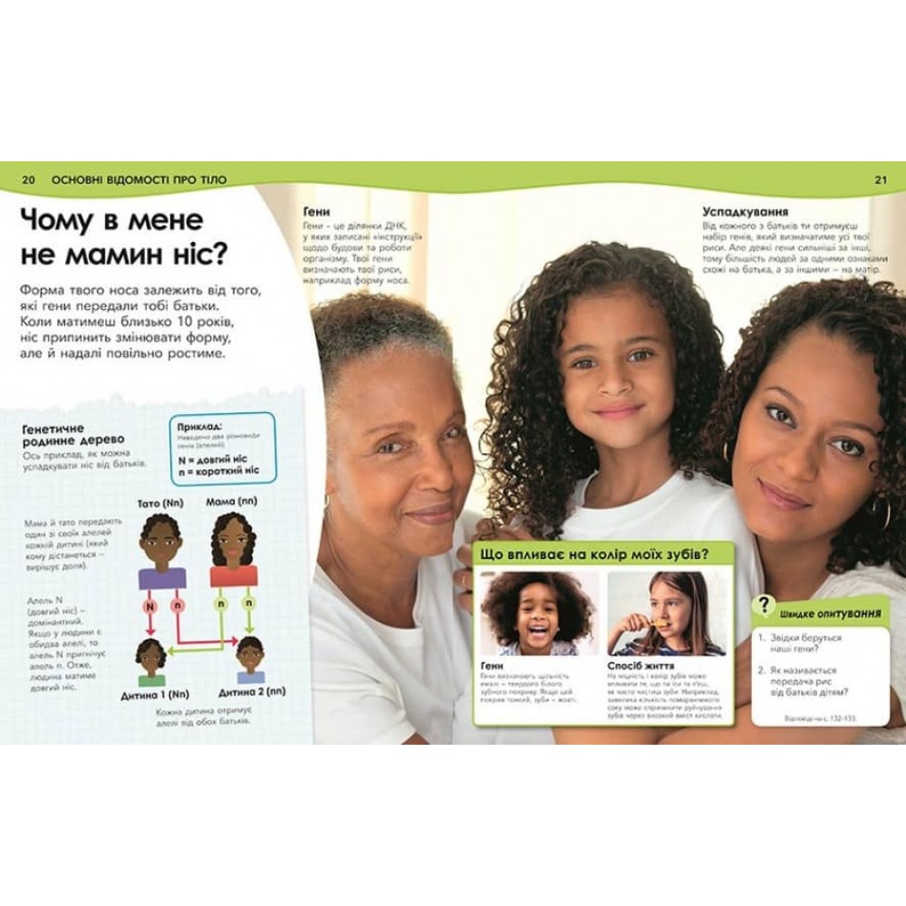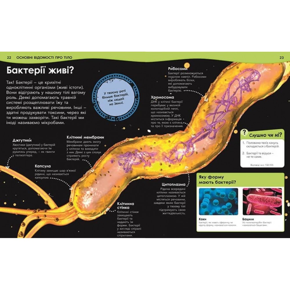 Який орган найбільший? Чому цукор на смак солодкий? Як мило вбиває мікробів? Чому кров червона?.. І ще багато запитань про все страшенно цікаве й гарне та надзвичайно кумедне й бридке в нашому тілі. Ви будете щиро вражені сотнями яскравих зображень дрібних органел, клітин, тканин і великих систем — усього того, що робить нас людьми.