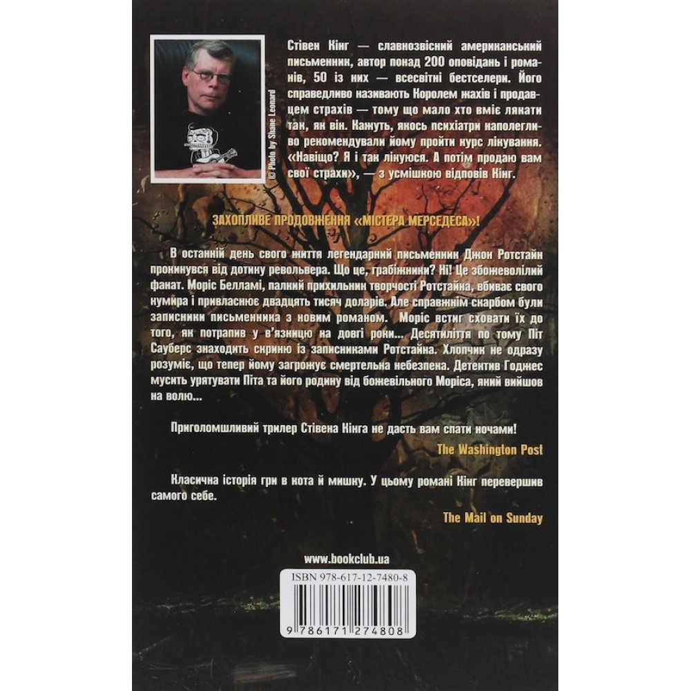 Легендарного письменника вбиває збожеволілий фанат Морріс Белламі. Він викрадає записники літератора, які містять його новий роман, але прочитати твір не встигає - поліція наступає йому на п’яти. Перш ніж потрапити до поліцейських рук, Морріс заховує свій скарб... Роки по тому хлопчик Піт Сауберс знаходить скриню із записниками славетного письменника. Але ця знахідка смертельно небезпечна — безжальний Белламі виходить на волю! Урятувати Піта від навіженого має детектив Ходжес...