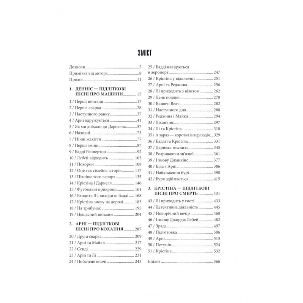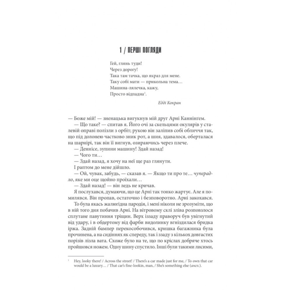Арні лузер. Хирляве посміховисько в окулярах у сталевій оправі й розсипом прищів на обличчі. У кожній школі є такий хлопець, якого дівчата наче не бачать. Арні жив собі таким, допоки не побачив Крістіну і не закохався в неї. І це геть не смішно від самого початку, хоч Крістіна — машина. А потім буде страшно…