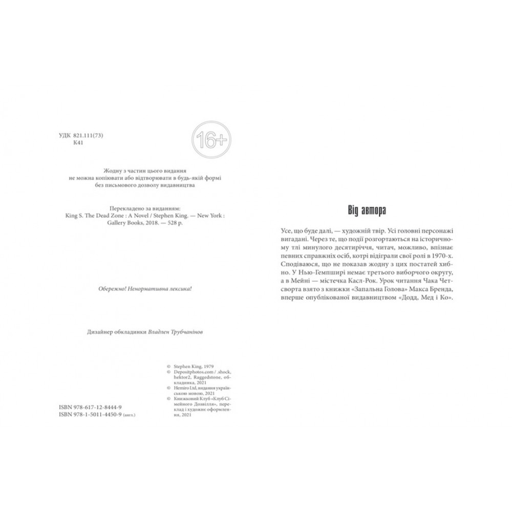 Коли через майже п’ять років Джон Сміт вийшов з коми, він, певно, пожалкував про це. За цей час тіло стало майже чужим, його дівчина обрала іншого, а рідна мати втратила зв’язок з реальністю. А ще треба вчитися жити з аномальною здібністю — бачити чуже майбутнє, лише торкнувшись людини. Тож повернутися до нормального життя не вийде. Особливо після того, як на передвиборчому мітингу Ґреґа Стіллсона Джонні тисне кандидатові руку. Миттєве передбачення вражає: Стіллсон виграє президентську гонку, очолить країну, а потім розв’яже ядерну війну та спричинить глобальну катастрофу. Проте змінити хід історії ще можливо. І в цьому заплутаному лабіринті Джонні бачить лише один вихід: вбити Ґреґа Стіллсона.