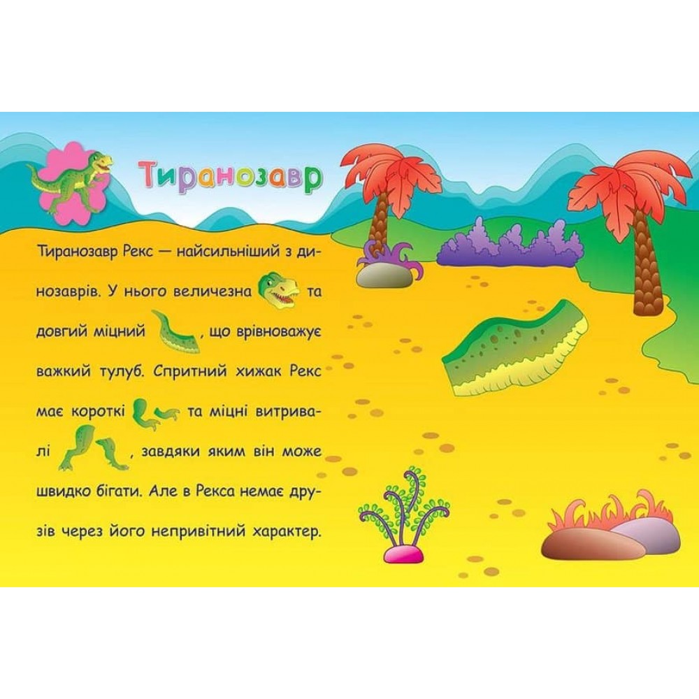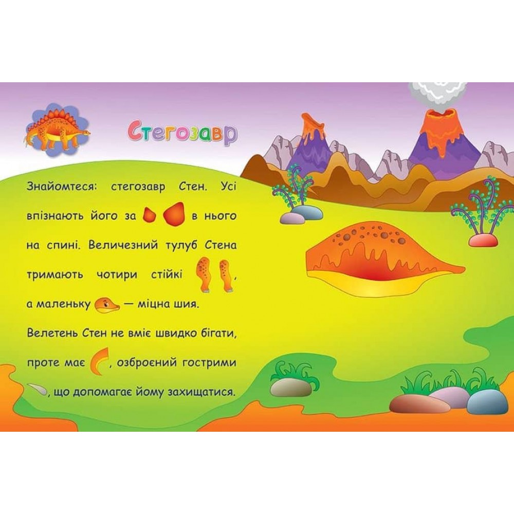 Разом із цим виданням малюк більше дізнається про динозаврів. Прочитайте разом цікаві описи трицератопса, тиранозавра чи диметродона! Користуючись підказками, дитина зможе знайти та додати до малюнку частини тіла динозаврів — лапи, хвости чи голови, щоб зібрати повне зображення. Щоб правильно розмістити наліпки, звертайте увагу на зразок. А ще з наліпок можна зібрати нового, ні на що не схожого динозавра! Створюючи кольорову аплікацію, дитина розвиває дрібну моторику та вчиться співвідносити частину й ціле.