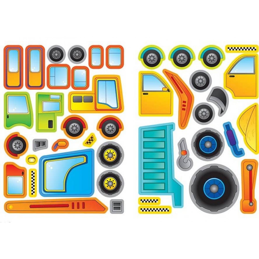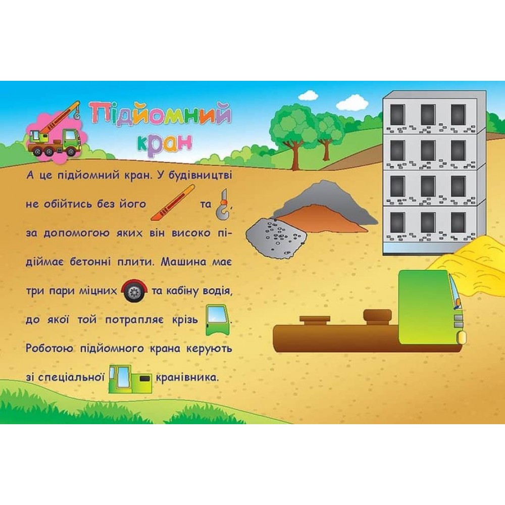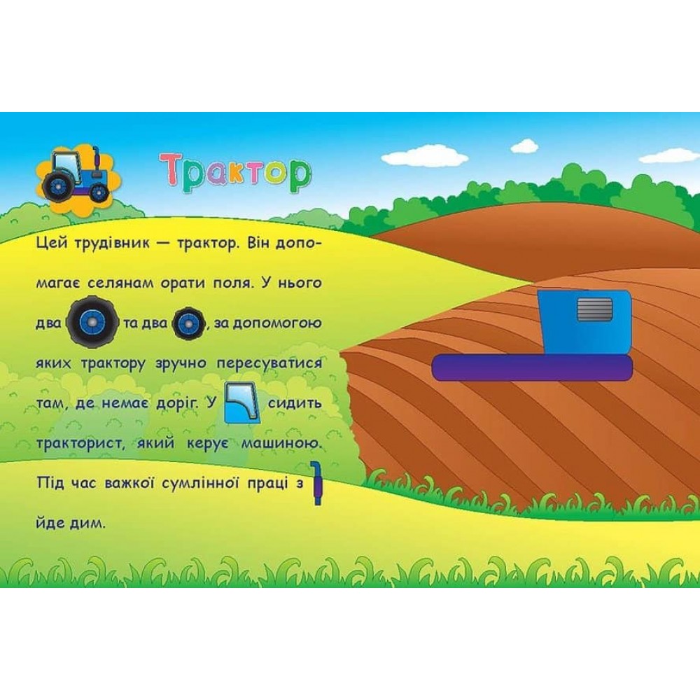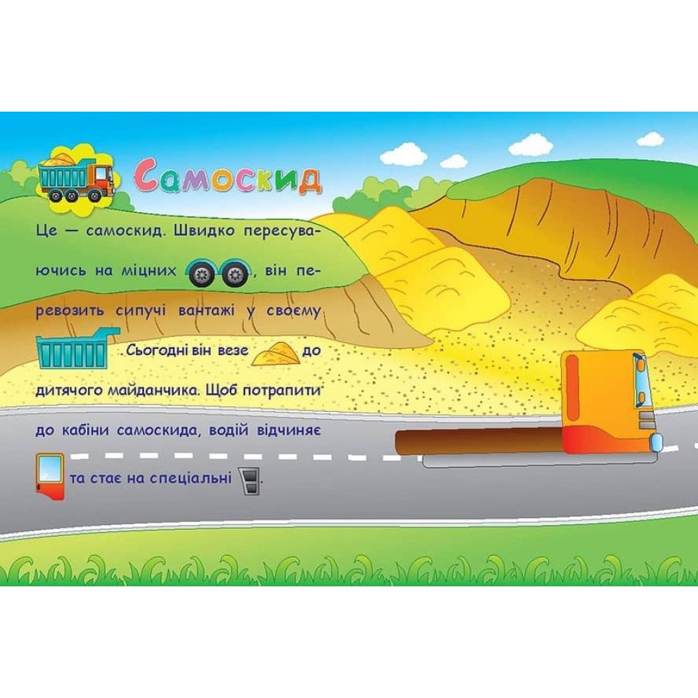 Разом із цим виданням малюк більше дізнається про корисні машини. Прочитайте разом цікаві описи таксі, самоскида чи трактора! Користуючись підказками, дитина зможе знайти та додати до малюнку частини машин: колеса, дверцята чи кабіну, щоб зібрати повне зображення. Щоб правильно розмістити наліпки, звертайте увагу на зразок. А ще з наліпок можна зібрати нову, ні на що не схожу машинку! Створюючи кольорову аплікацію, дитина розвиває дрібну моторику та вчиться співвідносити частину й ціле