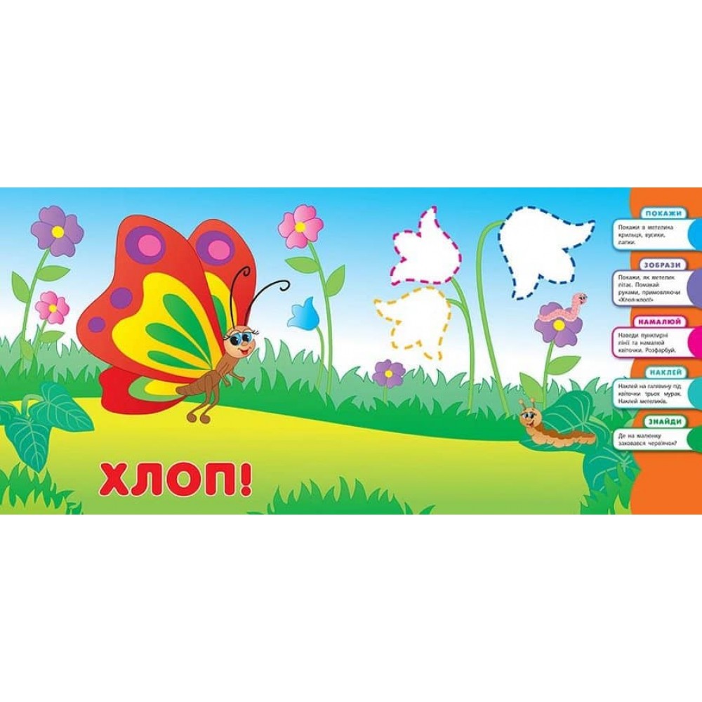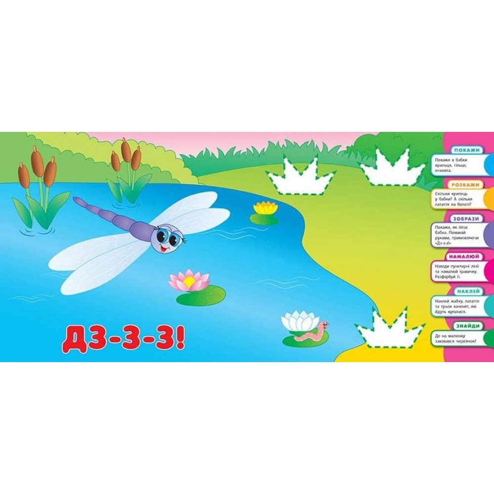 Це видання познайомить дітей з веселими комашками. Працюючи з книжкою, ваш малюк навчиться звуконаслідуванню, вивчить нові слова, потренується малювати прості лінії, клеїти наліпки, познайомиться з навколишнім світом. Різноманітні та цікаві завдання сприятимуть розвитку в малюка мовлення, дрібної моторики, уяви, спостережливості, пам’яті й уваги.