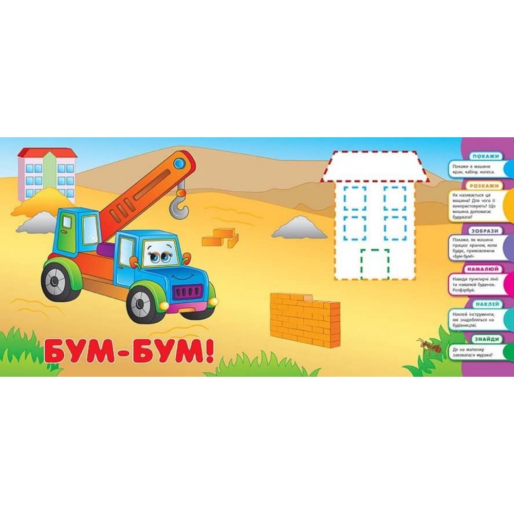Це видання познайомить дітей з веселими комашками. Працюючи з книжкою, ваш малюк навчиться звуконаслідуванню, вивчить нові слова, потренується малювати прості лінії, клеїти наліпки, познайомиться з навколишнім світом. Різноманітні та цікаві завдання сприятимуть розвитку в малюка мовлення, дрібної моторики, уяви, спостережливості, пам’яті й уваги.