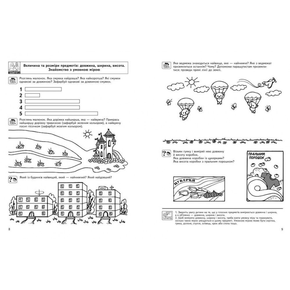 Посібники серії «Малятко» допоможуть вам якнайкраще підготувати дитину до школи. Розроблені педагогами-практиками, вони повністю відповідають сучасним методичним вимогам та санітарно-гігієнічним нормам, ураховують вікові фізіологічні та психологічні особливості дошкільників. Скомпонований за заняттями навчальний матеріал вичерпно охоплює обсяг умінь та знань, рекомендований дитині для засвоєння впродовж навчального року. Посібники серії однаково ефективно можуть бути використані як для індивідуальних занять, так і для колективної роботи з дітьми у дошкільних навчально-виховних закладах.Пропонований посібник сприятиме формуванню в дитини певних знань та навичок: лічби в межах десяти, вимірювання предметів за допомогою умовної міри, орієнтування в часі та просторі тощо.