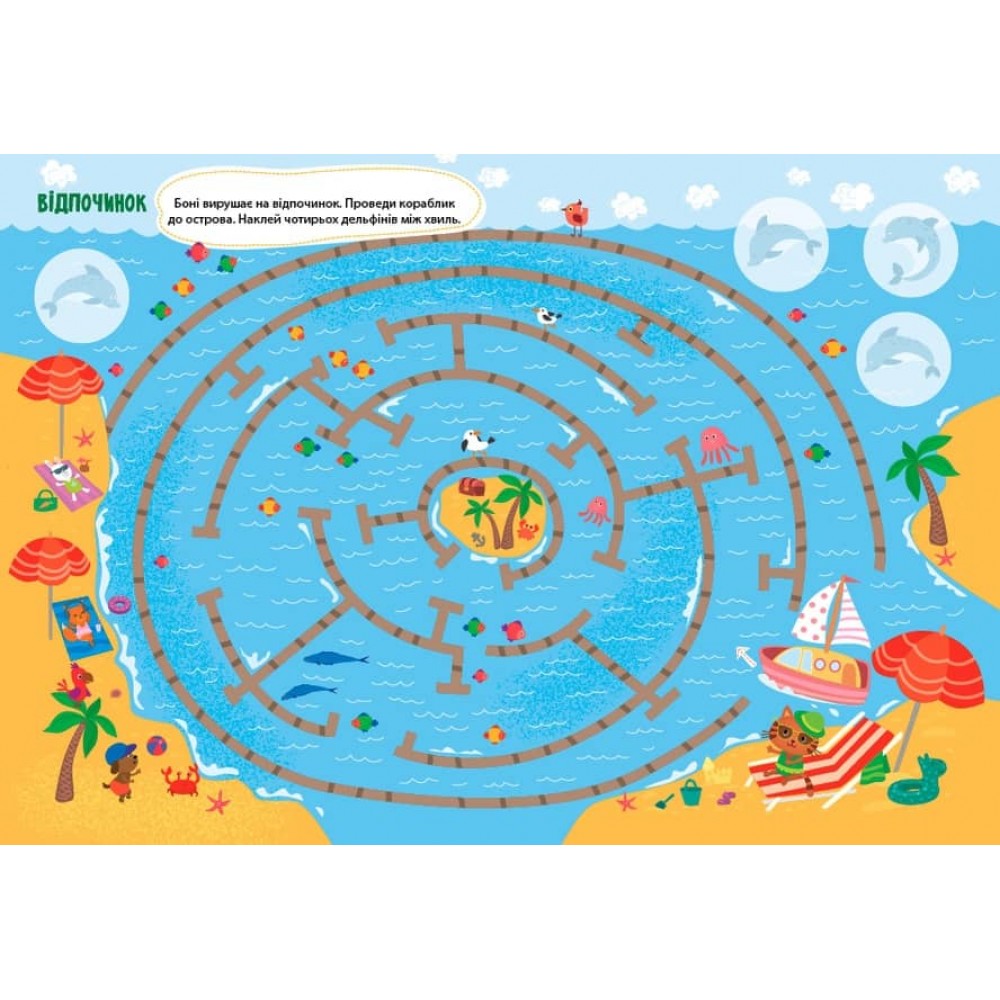Пончик запрошує дітей на пошуки пригод! Разом з ним вони літатимуть серед хмаринок, досліджуватимуть далекі галактики, відвідувати ферму, шукаючи правильний шлях у кожному лабіринті. Яскраві малюнки, великі наліпки та цікаві завдання допоможуть малюкам розвинути увагу, логічне мислення, фантазію та дрібну моторику пальців рук.