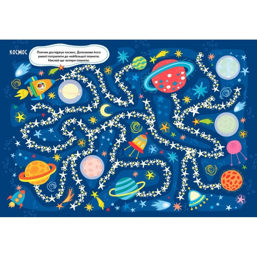 Пончик запрошує дітей на пошуки пригод! Разом з ним вони літатимуть серед хмаринок, досліджуватимуть далекі галактики, відвідувати ферму, шукаючи правильний шлях у кожному лабіринті. Яскраві малюнки, великі наліпки та цікаві завдання допоможуть малюкам розвинути увагу, логічне мислення, фантазію та дрібну моторику пальців рук.