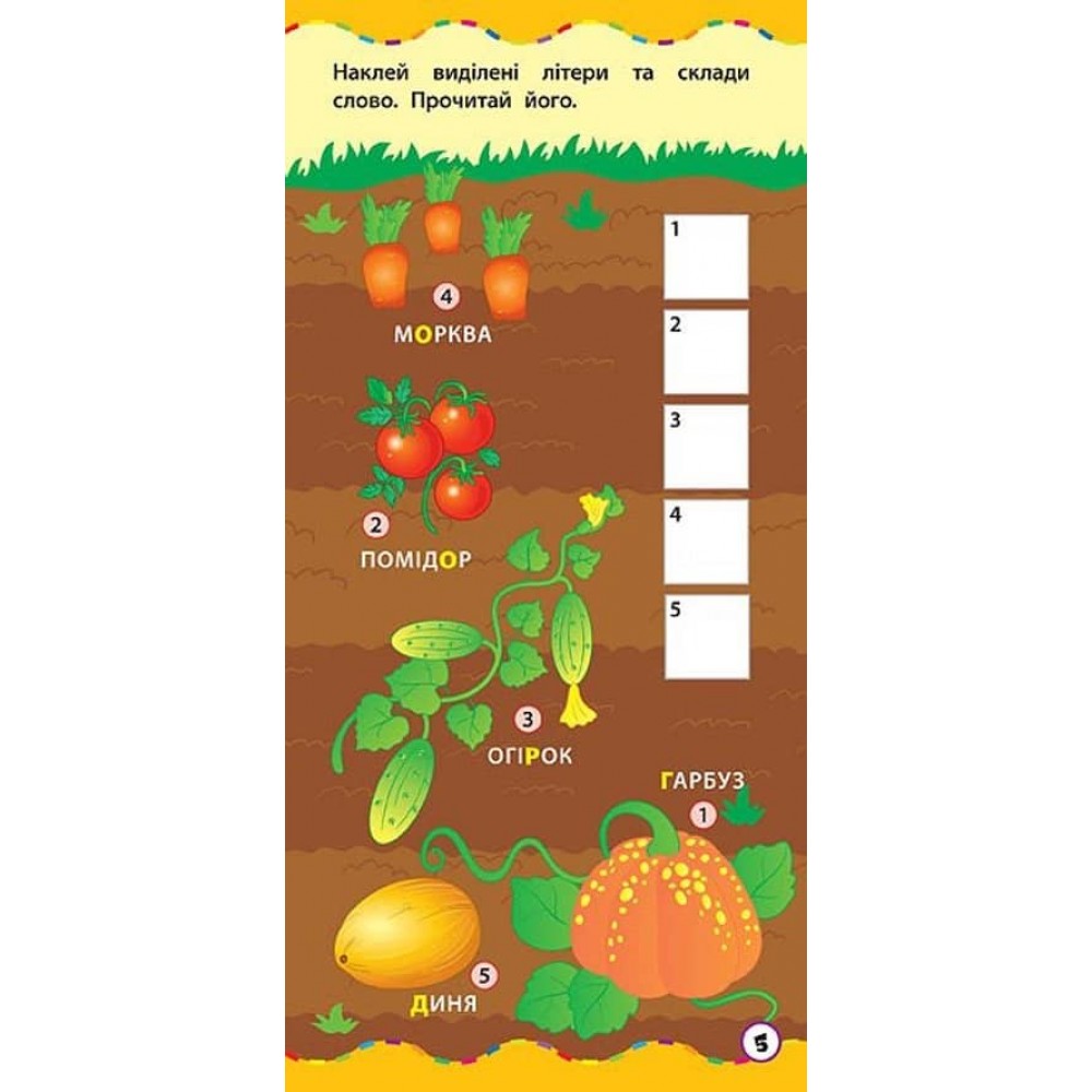 Із цією книгою ваша дитина легко та швидко запам’ятає букви українського алфавіту, навчиться впізнавати їх у словах, а також потренується утворювати склади та слова за допомогою наліпок. Видання призначене для спільної роботи дорослих з дітьми дошкільного віку.