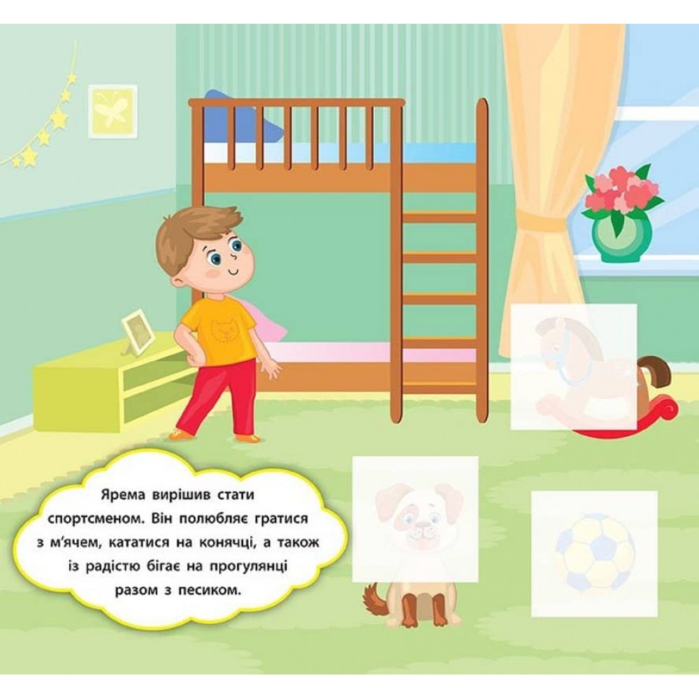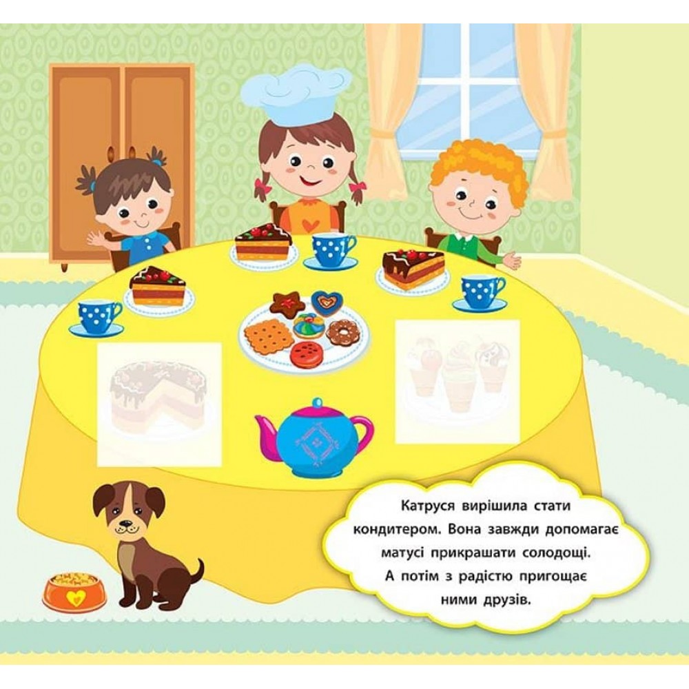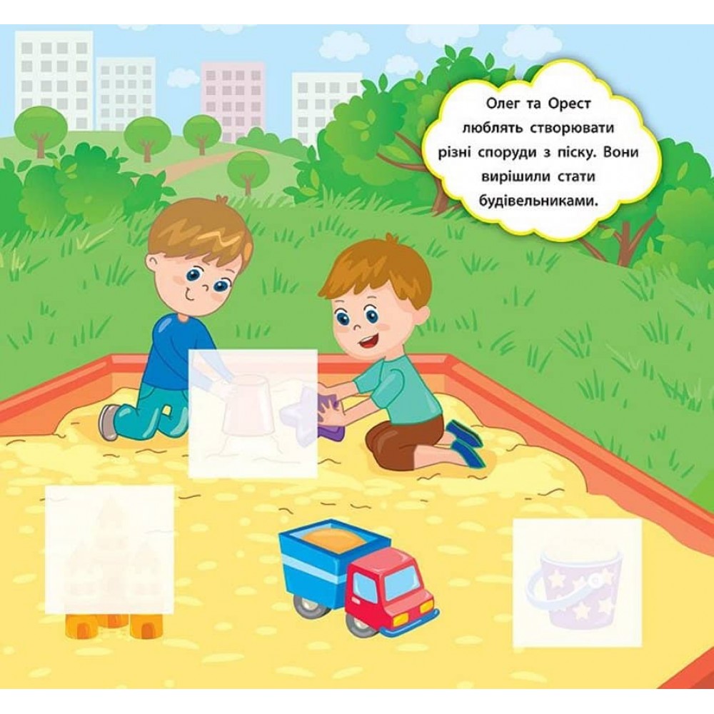 Ця книга розповість про різні ігри, які допоможуть малюкам відкрити для себе цікаві професії: учителя, кондитера, будівельника, пілота, ветеринара та інші. Також видання навчить малюків розрізняти поняття цілого та його частини. За допомогою фрагментів-наліпок дитина зможе доповнювати яскраві картинки, а короткі розповіді на кожній сторінці допоможуть батькам зацікавити малюка й стануть гарним поштовхом до створення власних історій. Книга сприятиме розвитку логічного мислення, фантазії, мовлення, уваги та дрібної моторики пальців рук. Видання призначене для спільної роботи дорослих з дітьми віком від двох років.