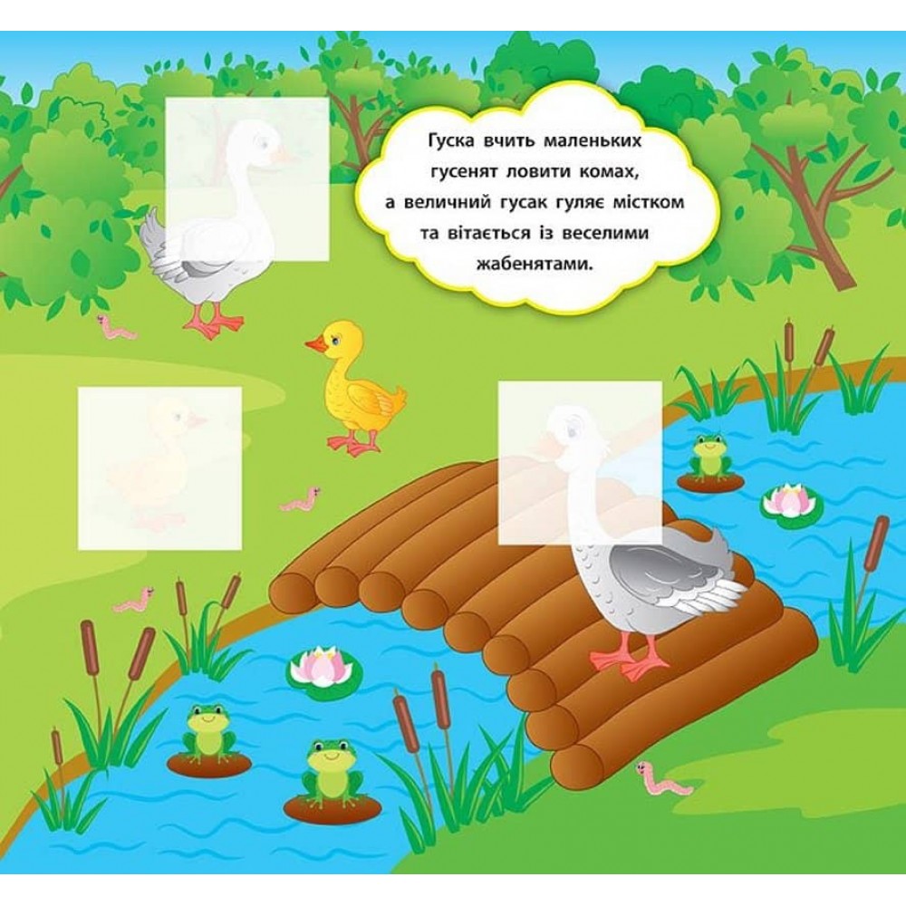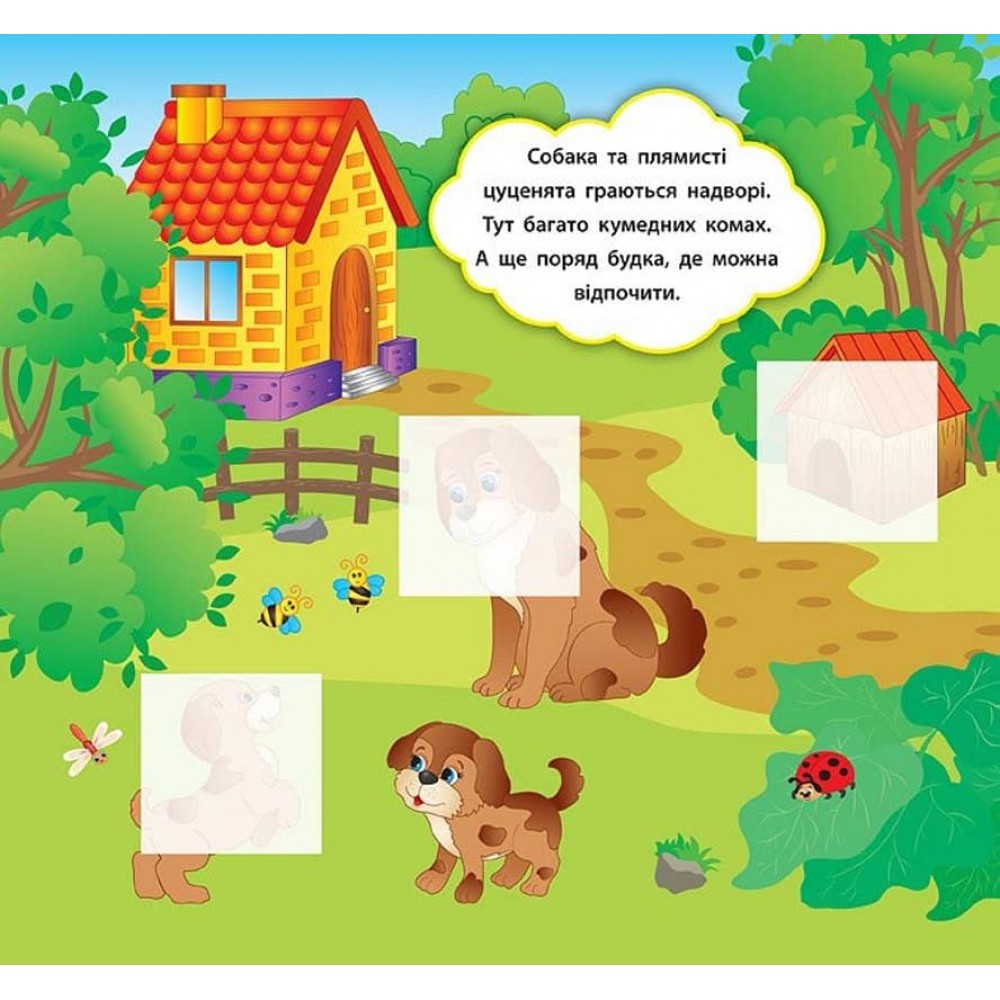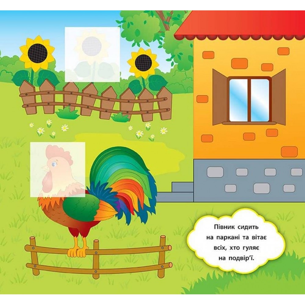 Ця книга познайомить дітей з багатьма свійськими тваринами: свинкою, індиком, куркою, качкою, кроликом та іншими. Також видання навчить малюків розрізняти поняття цілого та його частини. За допомогою фрагментів-наліпок дитина зможе доповнювати яскраві картинки, а короткі розповіді на кожній сторінці допоможуть батькам зацікавити малюка й стануть гарним поштовхом до створення власних історій. Книга сприятиме розвитку логічного мислення, фантазії, мовлення, уваги та дрібної моторики пальців рук. Видання призначене для спільної роботи дорослих з дітьми віком від двох років.