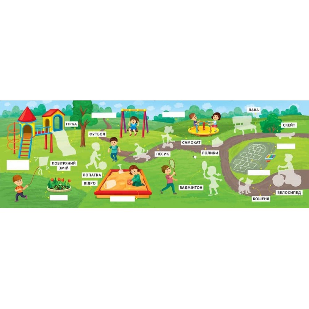 Ця книжка допоможе дитині вивчити назви предметів, які він бачить на прогулянці, а також іграшок та ігор, у які можна гратися на вулиці, поповнити словниковий запас, розширити кругозір, розвинути творче мислення, фантазію та кмітливість, а також покращити дрібну моторику пальців рук. Видання містить ілюстрований словничок, у якому підписи поділені на склади. Велика панорамна картинка, кольорові наліпки та незвичайний формат гарантують вам і вашому малюку захопливе й пізнавальне дозвілля! Видання призначене для спільної роботи дорослих з дітьми дошкільного віку.