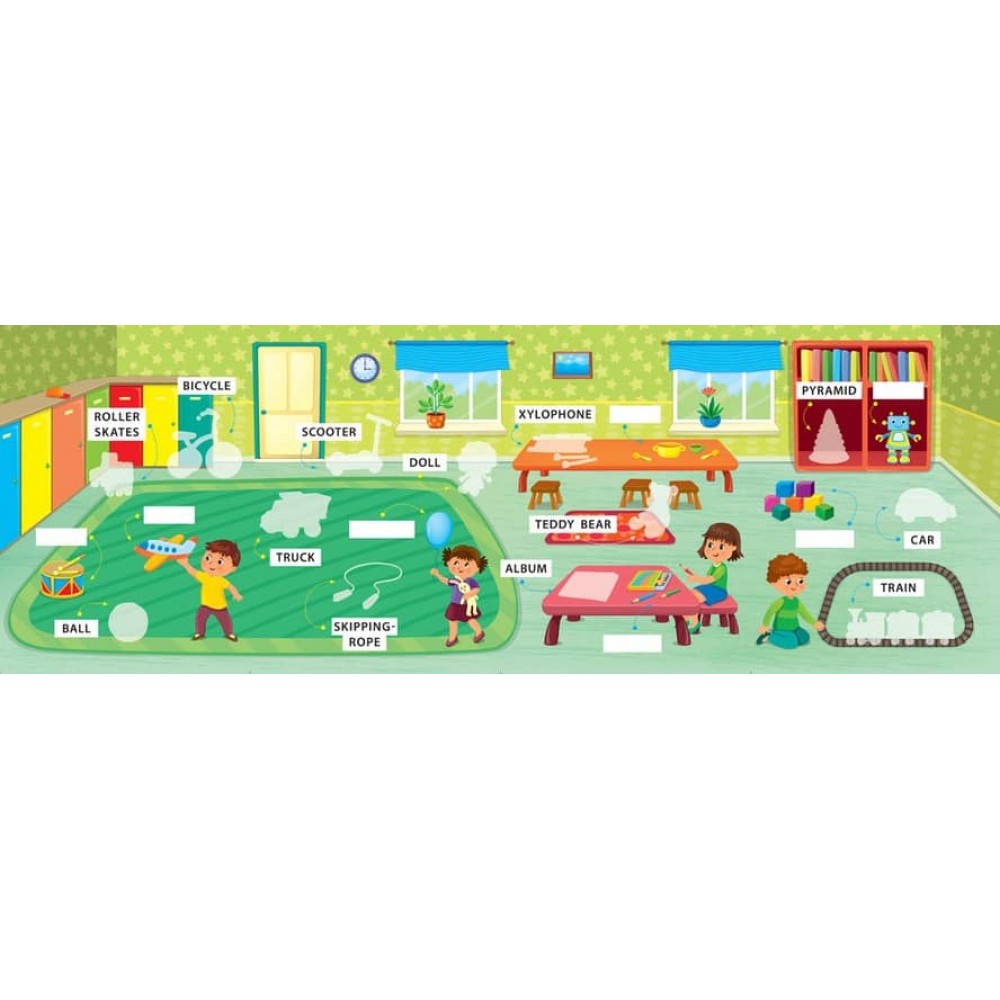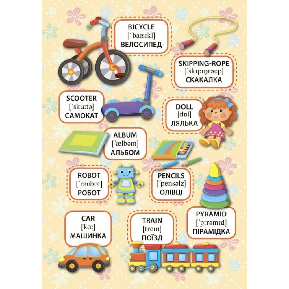 Ця книжка допоможе дитині вивчити назви іграшок англійською мовою, поповнити словниковий запас, розширити кругозір, розвинути творче мислення, фантазію та кмітливість, а також покращити дрібну моторику пальців рук. Велика панорамна картинка, ілюстрований словничок, кольорові наліпки та незвичайний формат гарантують вам і вашому малюку захопливе й пізнавальне дозвілля! Видання призначене для спільної роботи дорослих з дітьми дошкільного віку.
