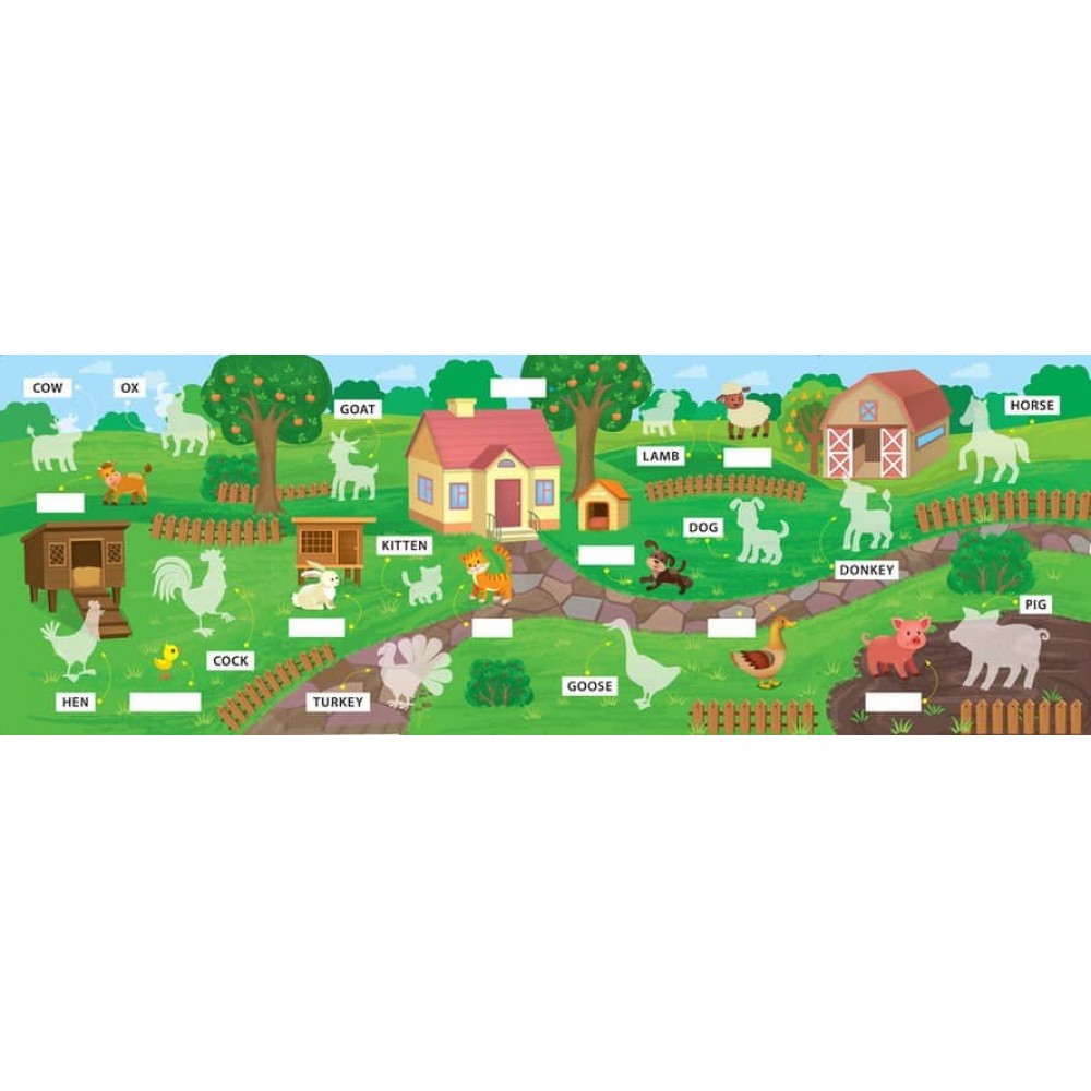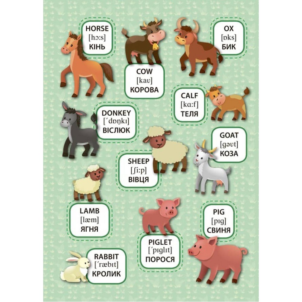 Ця книжка допоможе дитині вивчити назви свійських тварин англійською мовою, поповнити словниковий запас, розширити кругозір, розвинути творче мислення, фантазію та кмітливість, а також покращити дрібну моторику пальців рук. Велика панорамна картинка, ілюстрований словничок, кольорові наліпки та незвичайний формат гарантують вам і вашому малюку захопливе й пізнавальне дозвілля! Видання призначене для спільної роботи дорослих з дітьми дошкільного віку.