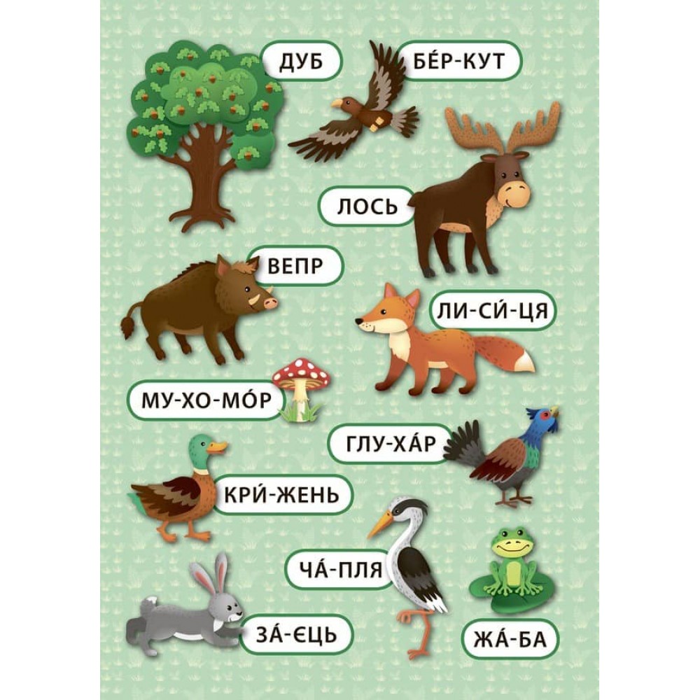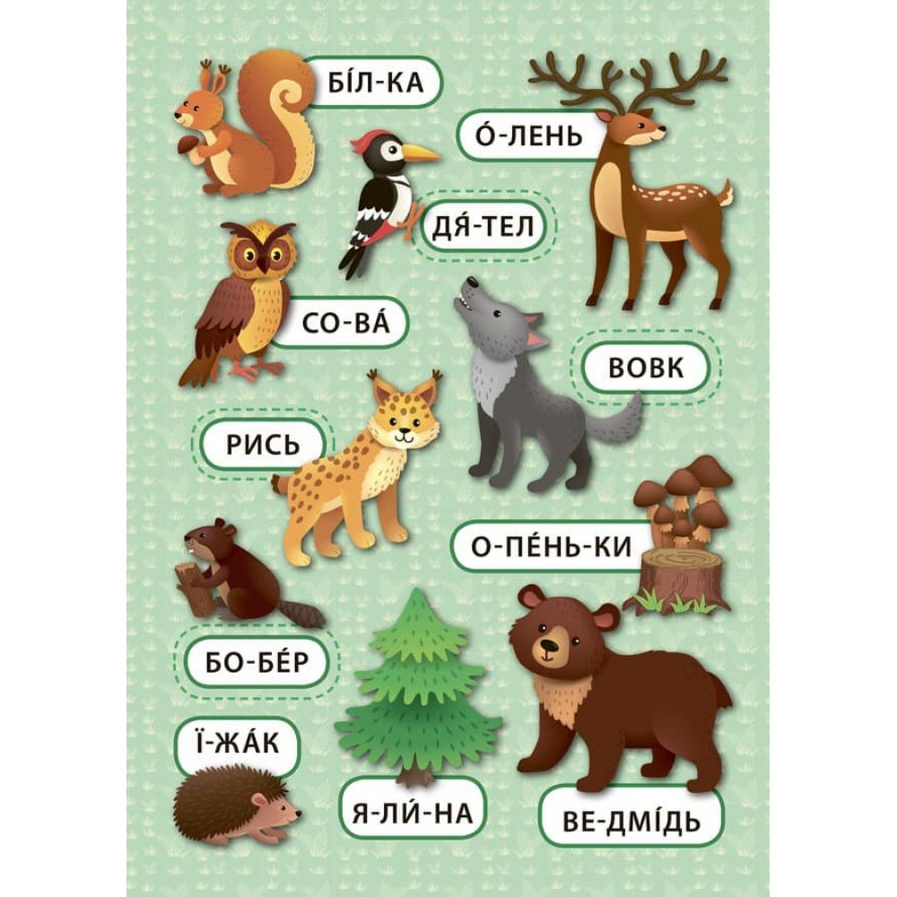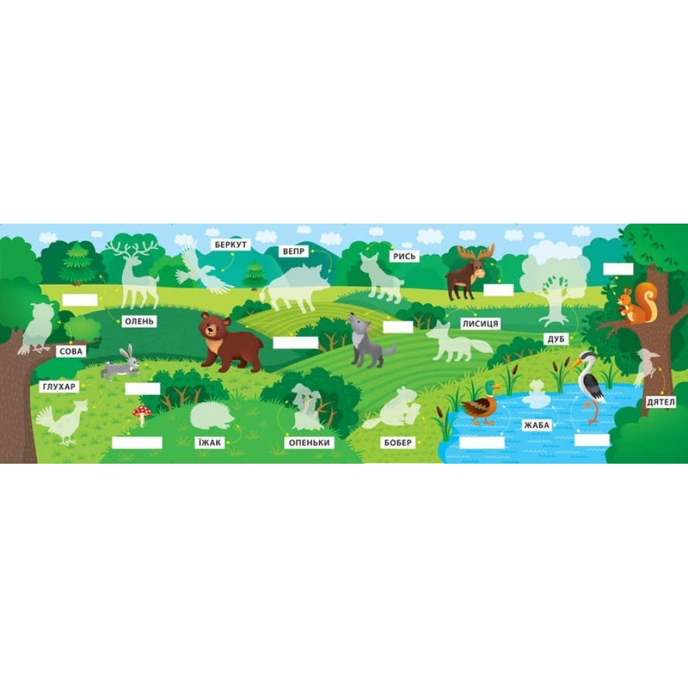 Ця книжка допоможе дитині вивчити назви лісових звірів, птахів і рослин, поповнити словниковий запас, розширити кругозір, розвинути творче мислення, фантазію та кмітливість, а також покращити дрібну моторику пальців рук. Видання містить ілюстрований словничок, у якому підписи поділені на склади. Велика панорамна картинка, кольорові наліпки та незвичайний формат гарантують вам і вашому малюку захопливе й пізнавальне дозвілля! Видання призначене для спільної роботи дорослих з дітьми дошкільного віку.