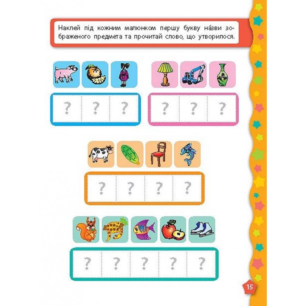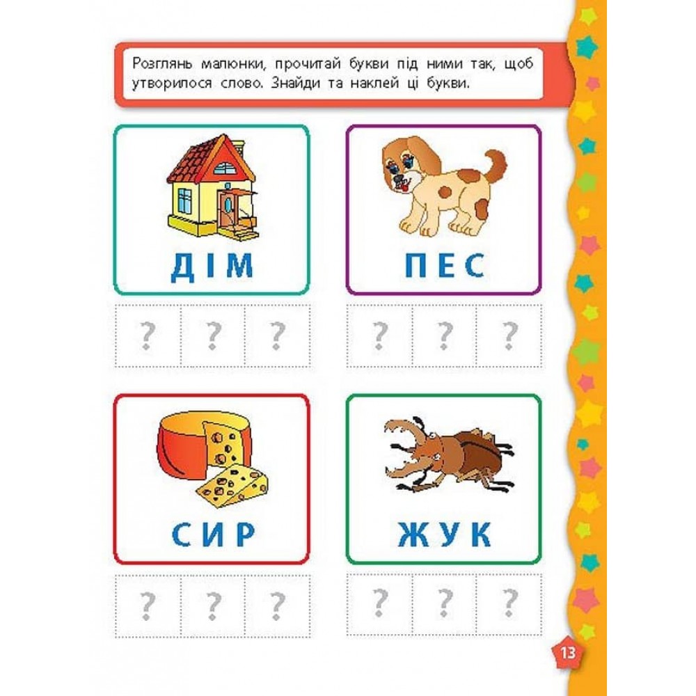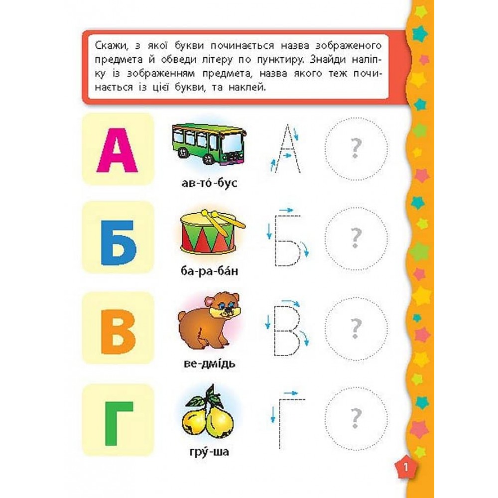 Із цією книгою ваша дитина легко вивчить букви українського алфавіту, потренується впізнавати їх та знаходити в словах, а також читати слова й складати їх з наліпок. Видання призначене для роботи дорослих з дітьми дошкільного віку.