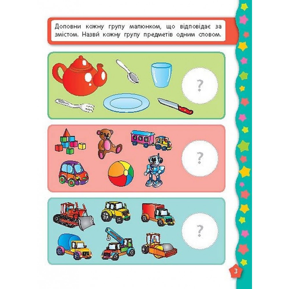 Із цією книгою ваша дитина навчиться порівнювати предмети та знаходити загальні або протилежні за змістом ознаки, установлювати логічні зв’язки між предметами й добирати узагальнювальні назви, а також потренується розв’язувати прості логічні задачі. Видання призначене для роботи дорослих з дітьми дошкільного віку