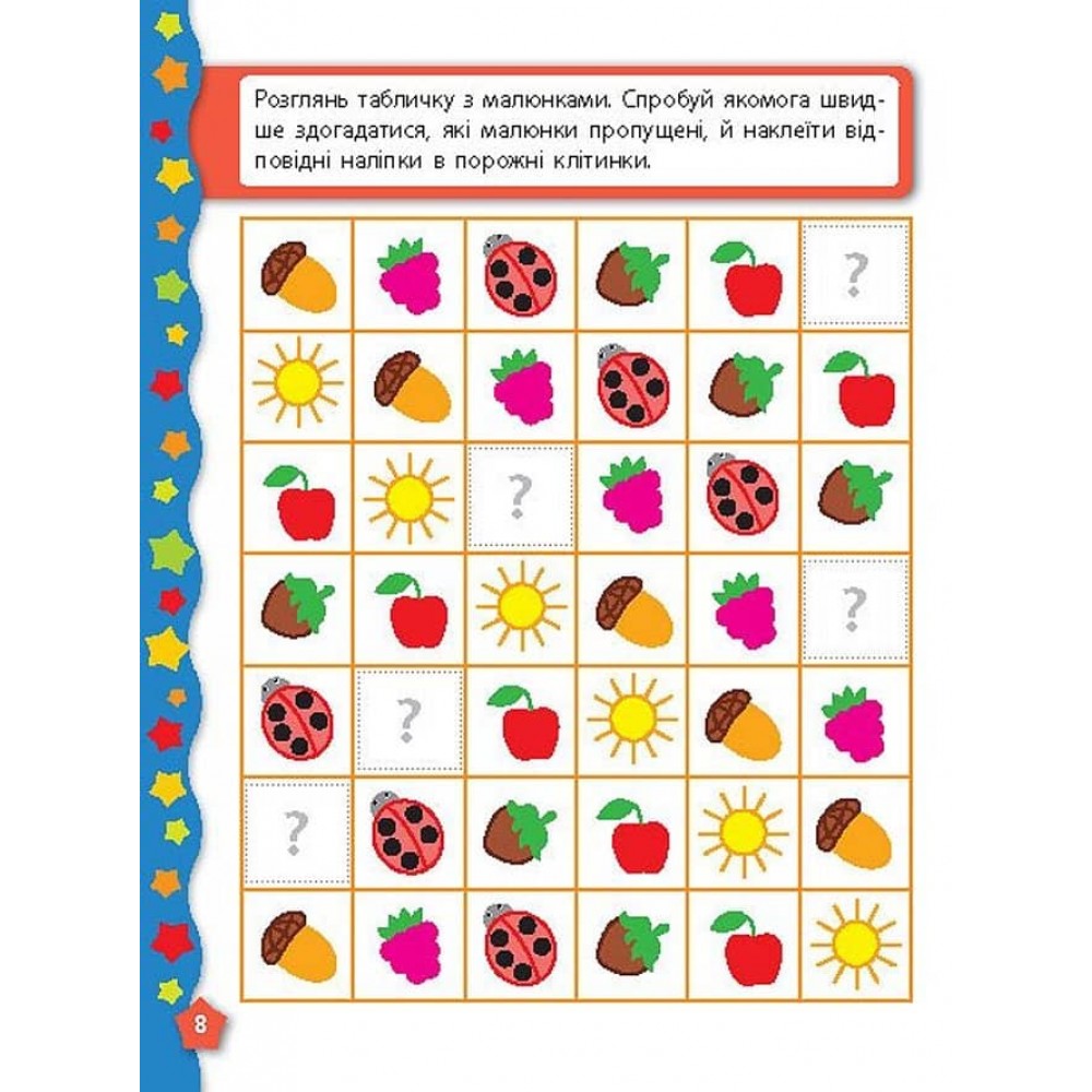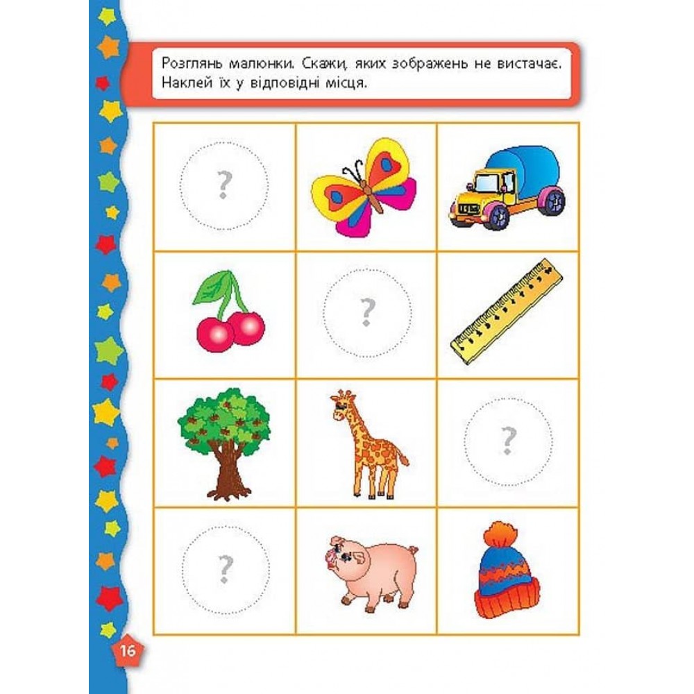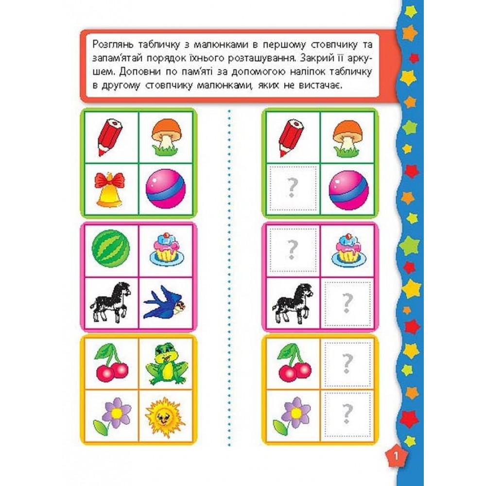 Ця книга містить різноманітні завдання, що сприятимуть розвитку пам’яті та уваги вашого малюка. Виконуючи ігрові завдання, дитина повправляється у запам’ятовуванні й відтворюванні послідовності слів та малюнків, потренується порівнювати й знаходити відмінності між зображеннями, установлювати логічні зв’язки між предметами, навчиться розв’язувати прості логічні задачі. Видання призначене для спільної роботи дорослих з дітьми дошкільного віку.