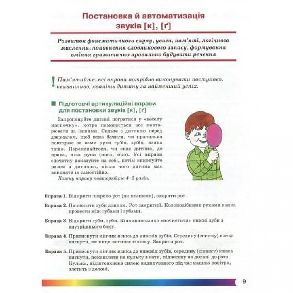 Книга допоможе батькам, у чиїх діток проблеми з вимовою звуків. За допомогою різних вправ і завдань, батьки, займаючись з малюком 10-15 хвилин на день, зможуть зкорегувати мову дитини, розвинути у неї пам'ять і логічне мислення. Барвисте оформлення завдань, загадки, скоромовки зроблять заняття з карапузом більш захоплюючими і корисними. Рекомендується для дітей від 4-х років.