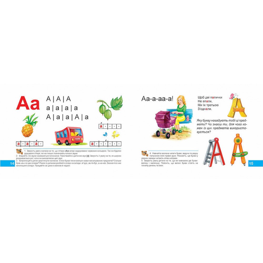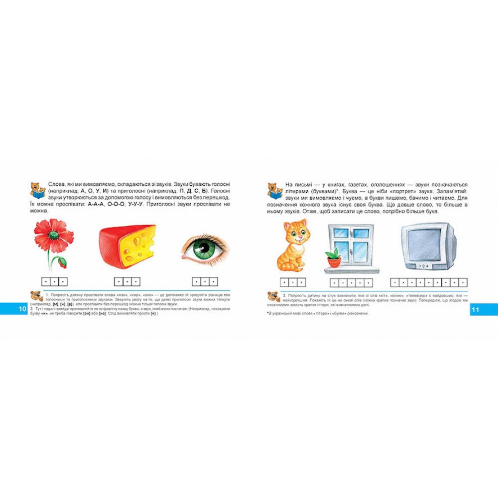 На кожній сторінці є додатковий коментар як навчати малюка та яким завданням слід приділити особливу увагу. У кінці розміщений додатковий матеріал для батьків — коментар до звукового аналізу слів, а на зворотному боці обкладинки намальована українська абетка.