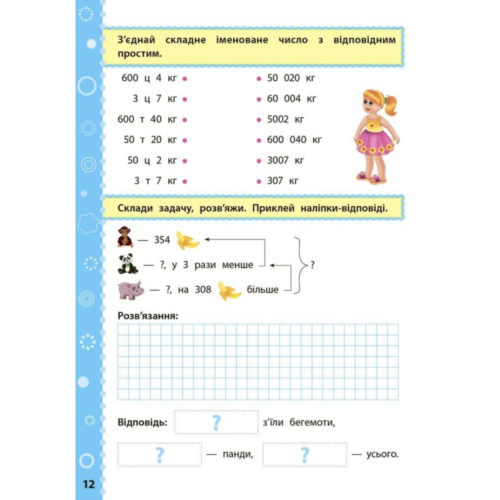 Видання охоплює матеріал 4 класу з предмета «Математика» і відповідає вимогам освітніх програм математичної галузі Нової української школи. Ігрова форма завдань, 100 наліпок і яскраві ілюстрації допоможуть легко сформувати ключові компетентності дитини та закріпити набуті в школі знання.