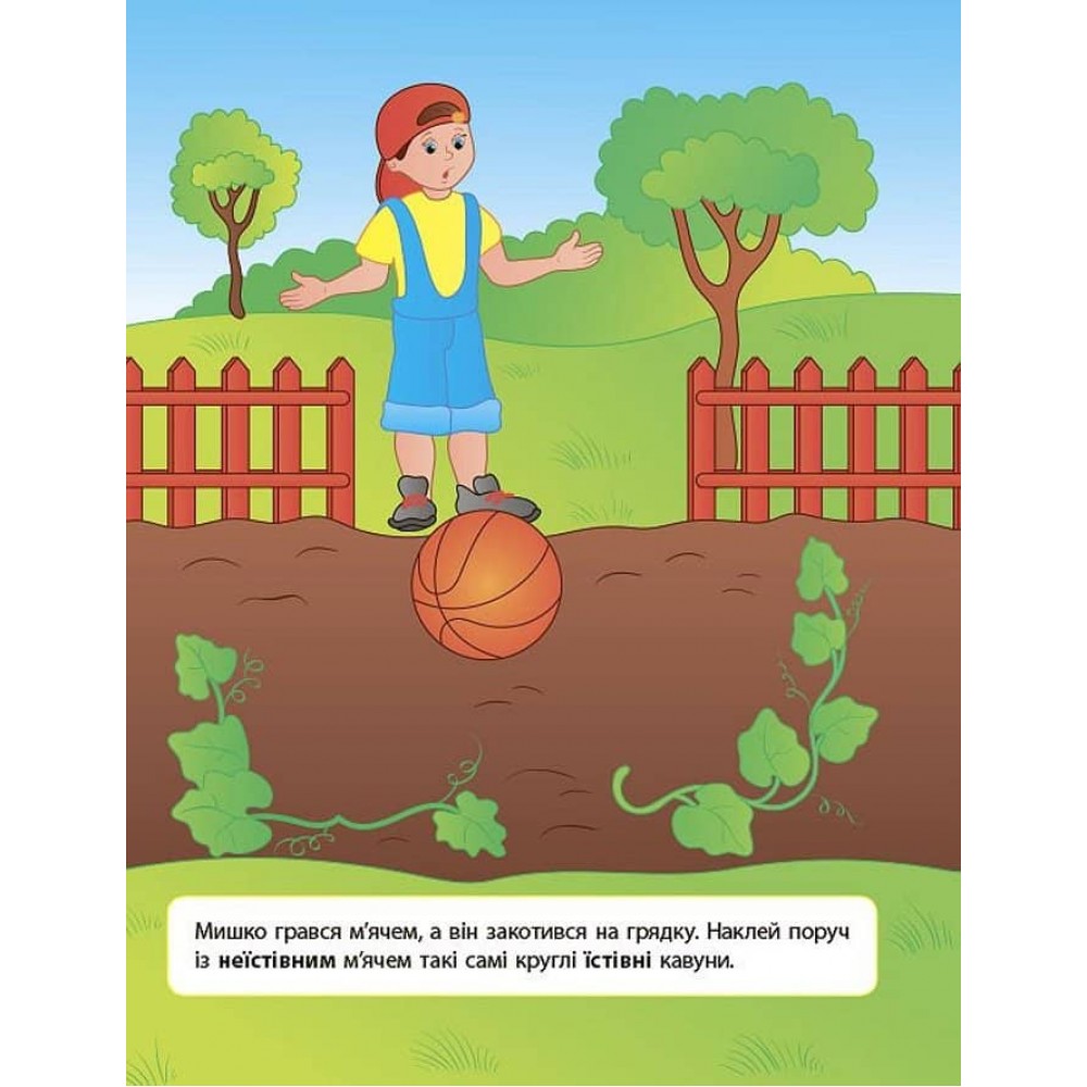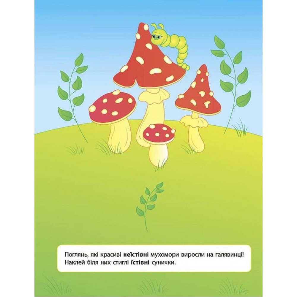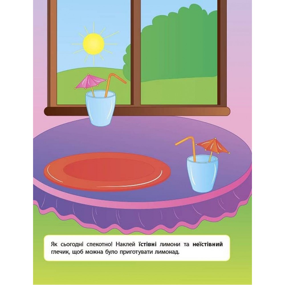 Пізнавати світ через гру — що може бути веселіше? Малюк з цікавістю познайомиться з поняттями «їстівний» та «неїстівний», граючись із наліпками. Дитина зможе потренуватися відрізняти їстівні предмети від неїстівних, наклеїти барвисті наліпки та відповісти на питання, щоб перевірити себе. Граючись, малюк буде отримувати нові знання без нудьги й утоми!