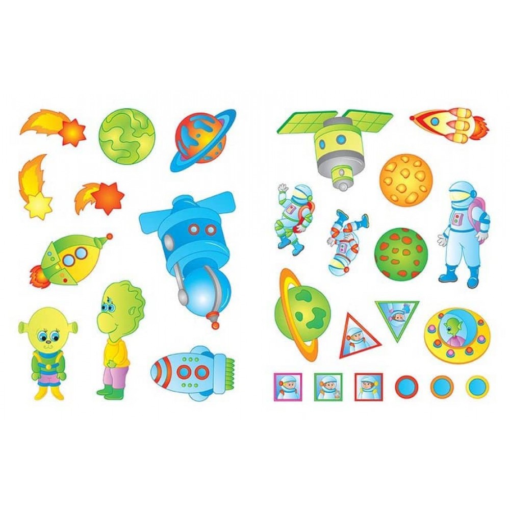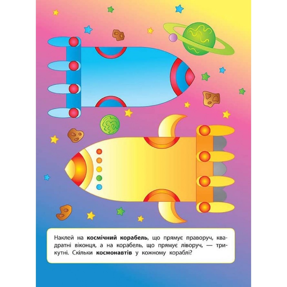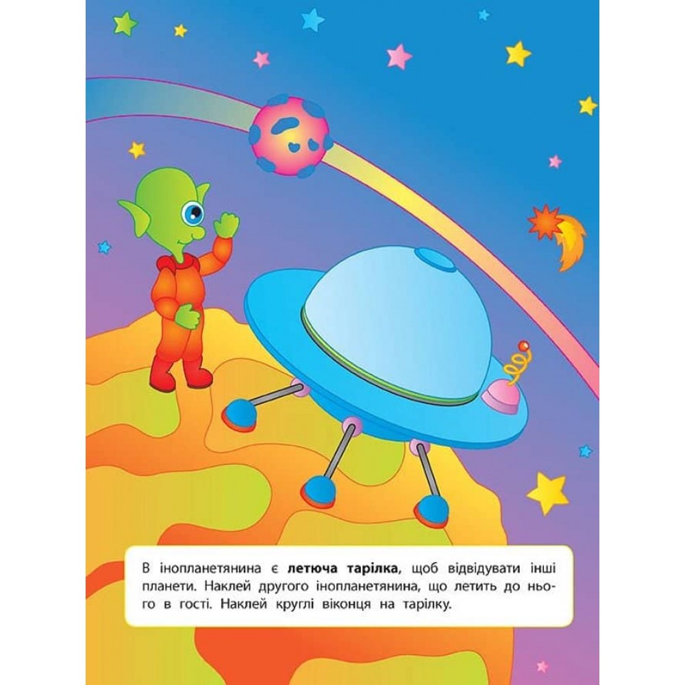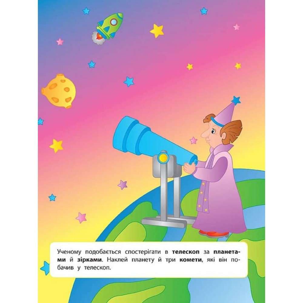 Пізнавати світ через гру — що може бути веселіше? Малюк з цікавістю дізнається більше про космічні тіла, граючись із наліпками. Дитина зможе прочитати цікаву інформацію про зірки, космічні кораблі чи штучні супутники Землі, наклеїти барвисті наліпки та відповісти на питання, щоб перевірити себе. Граючись, малюк буде отримувати нові знання без нудьги й утоми!