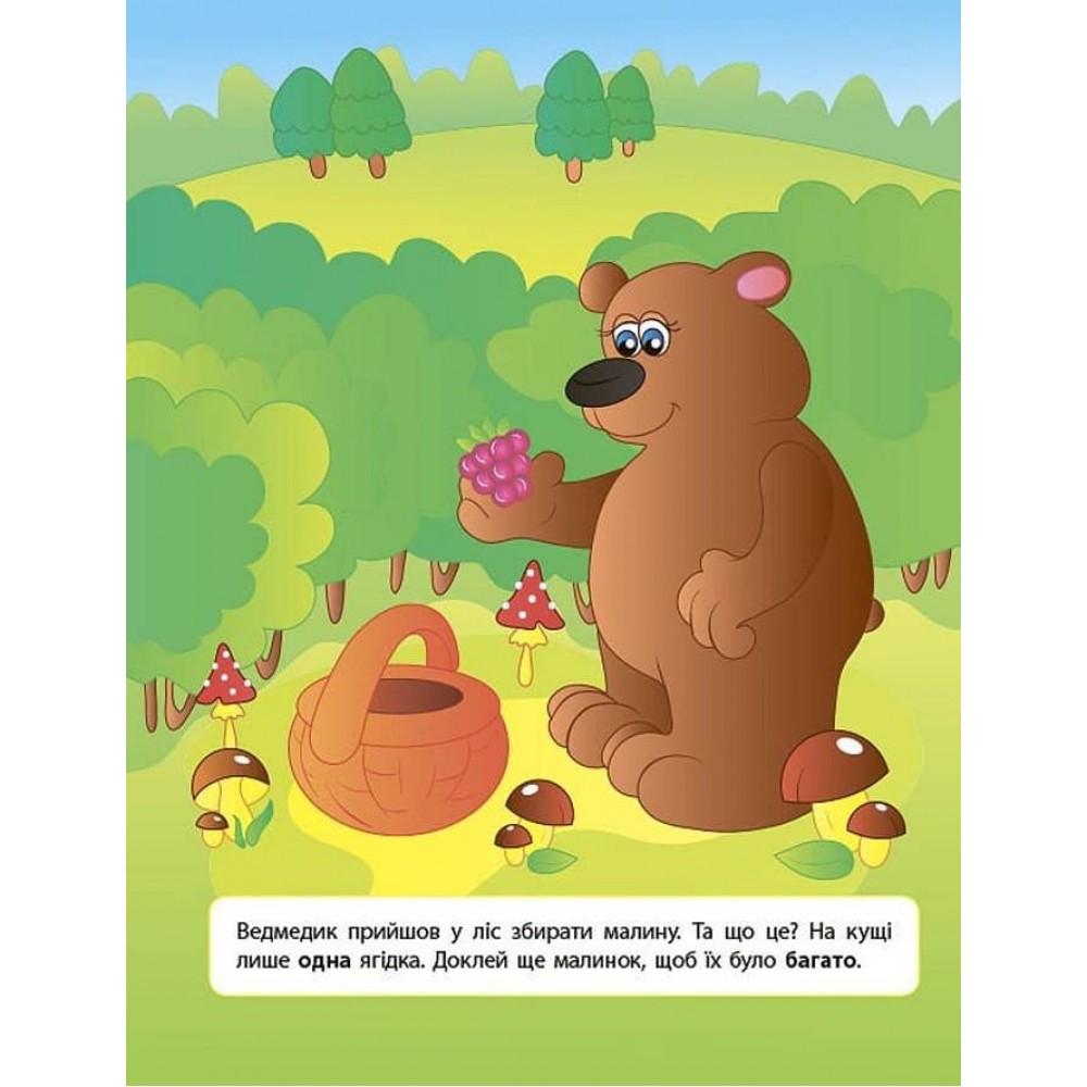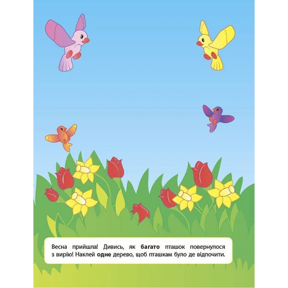 Пізнавати світ через гру — що може бути веселіше? Малюк з цікавістю познайомиться з поняттями «один» та «багато», граючись із наліпками. Дитина зможе потренуватися розрізняти один предмет та групу предметів, наклеїти барвисті наліпки та відповісти на питання, щоб перевірити себе. Граючись, малюк буде отримувати нові знання без нудьги й утоми!
