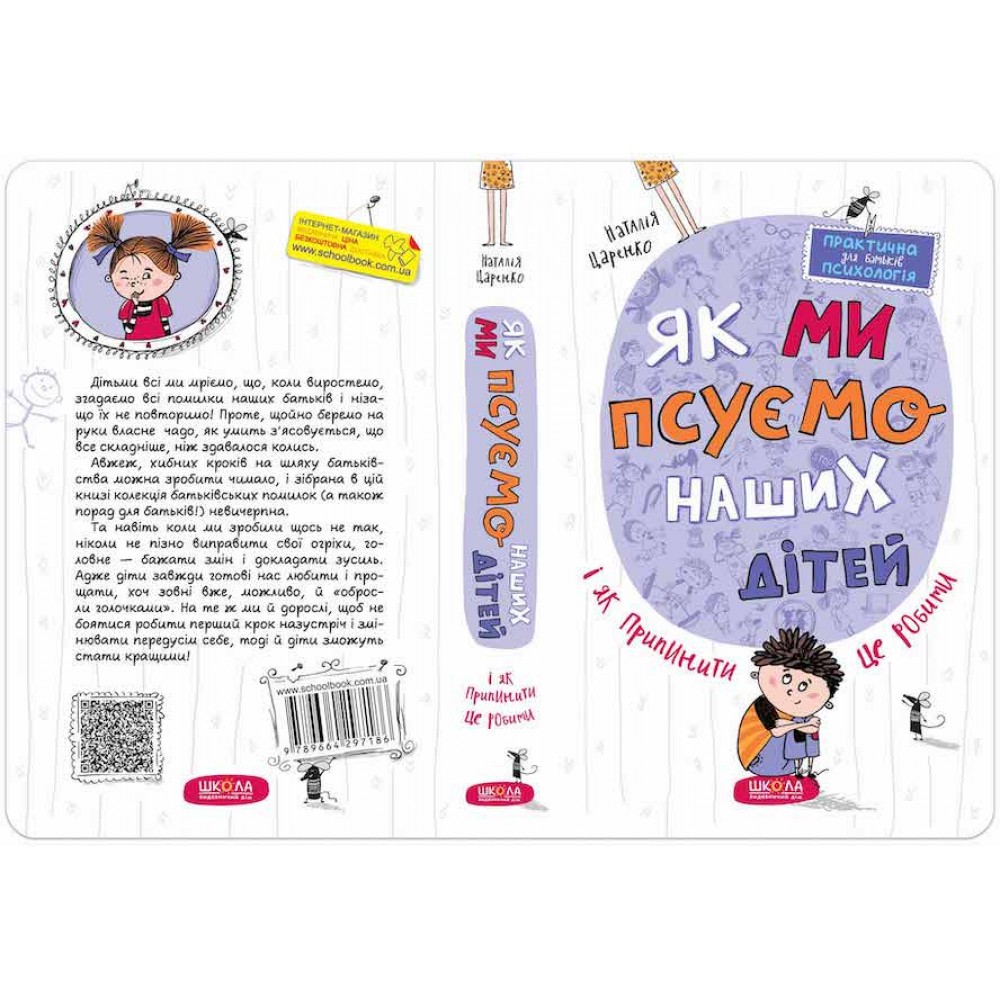 Після шести перевидань книга «Як ми псуємо наших дітей і як припинити це робити» від дитячого та сімейного психолога Наталії Царенко стала вдосконаленою збіркою найпоширеніших, можна сказати, хрестоматійних помилок у батьківстві. Авторка з височини свого професійного й батьківського досвіду буквально «по поличках» розкладає всі хибні переконання, що здатні зашкодити маленькій особистості, світогляд та моральні засади якої лише починають формуватися. У цьому виданні кожен з батьків упізнає свої улюблені педагогічні прийоми, які, виявляється, є руйнівними для довірливих та гармонійних відносин з дитиною. Ця збірка є надійним помічником та мудрим порадником для всіх, хто прагне створити сприятливу атмосферу в родині. Книга розбиває на друзки стереотипи про виховання: те, що здавалося перевіреним та дієвим методом, насправді є нічим іншим, як прикрою помилкою, яка з часом може призвести до негативних наслідків. Праця Наталії Царенко не лише вказує на недоліки та похибки у стосунках з дітьми, але також пропонує шляхи їх подолання і заохочує до позитивних змін.