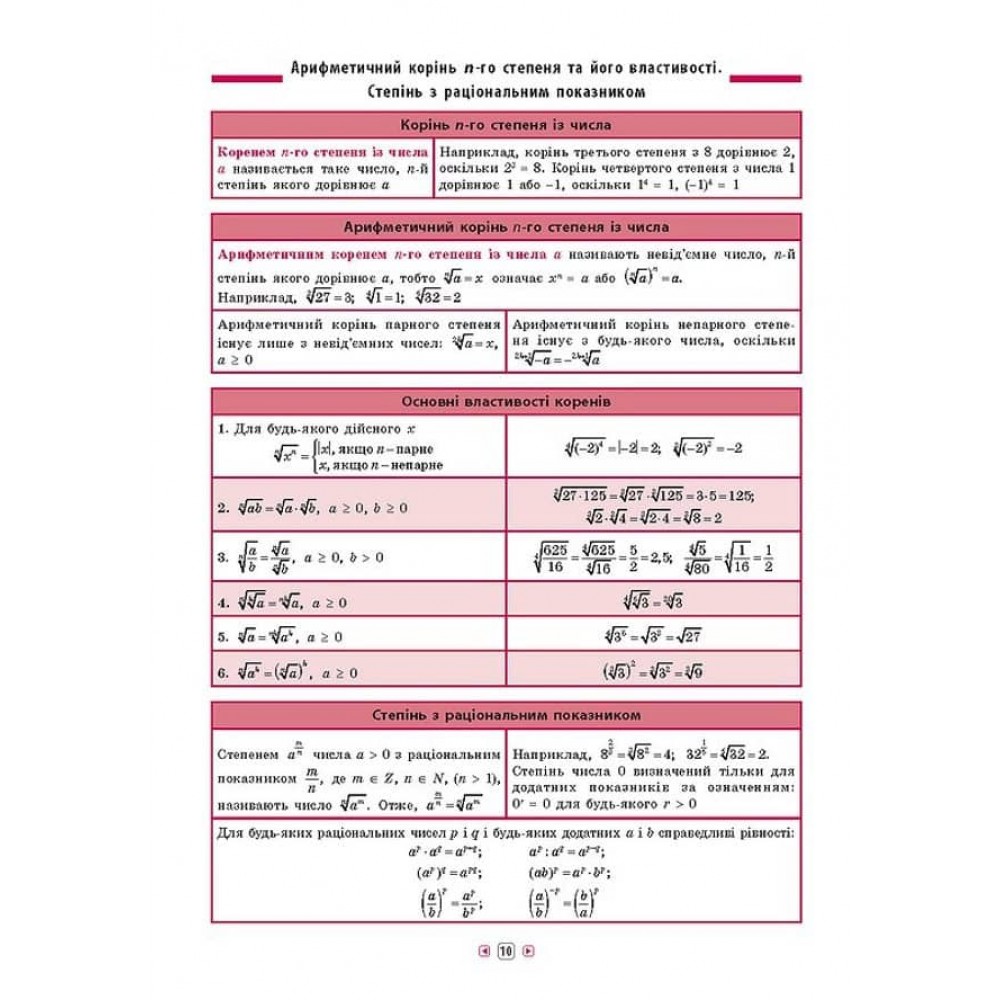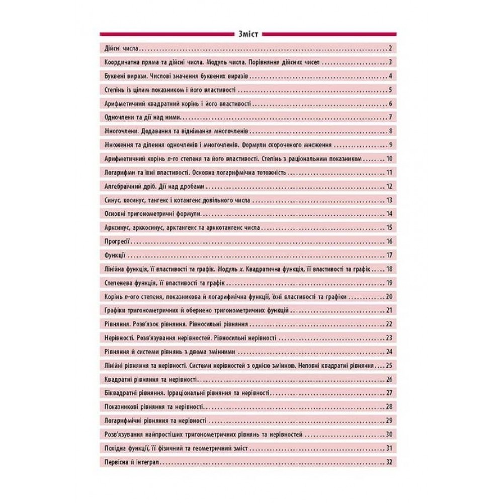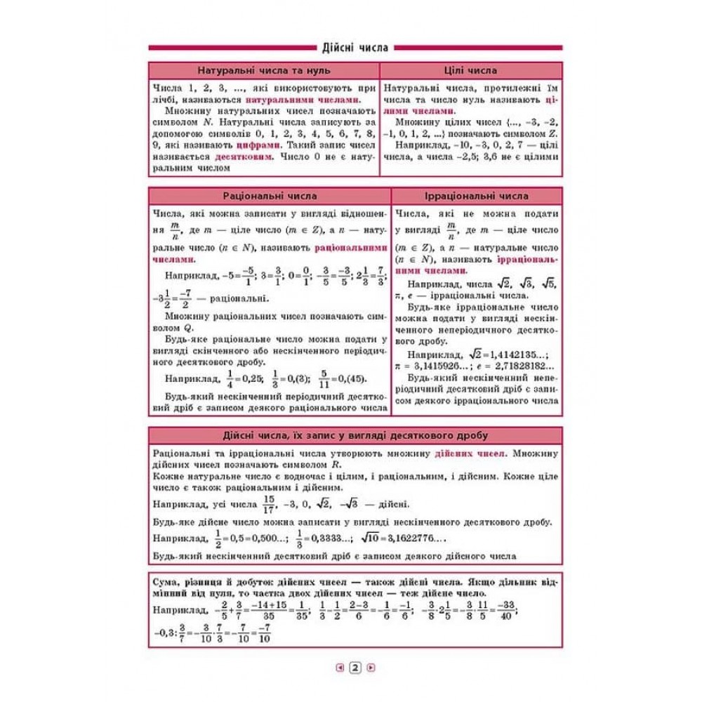 Довідник з алгебри допоможе учням 7-11 класів покращити свої знання та підготуватися до самостійних чи контрольних робіт, а також до незалежного оцінювання. Інформація подана стисло та чітко у вигляді таблиць, що спрощує пошук потрібної інформації — формул, визначень чи правил. Працювати з довідником зручно та швидко!