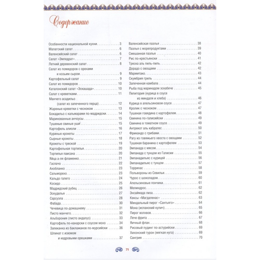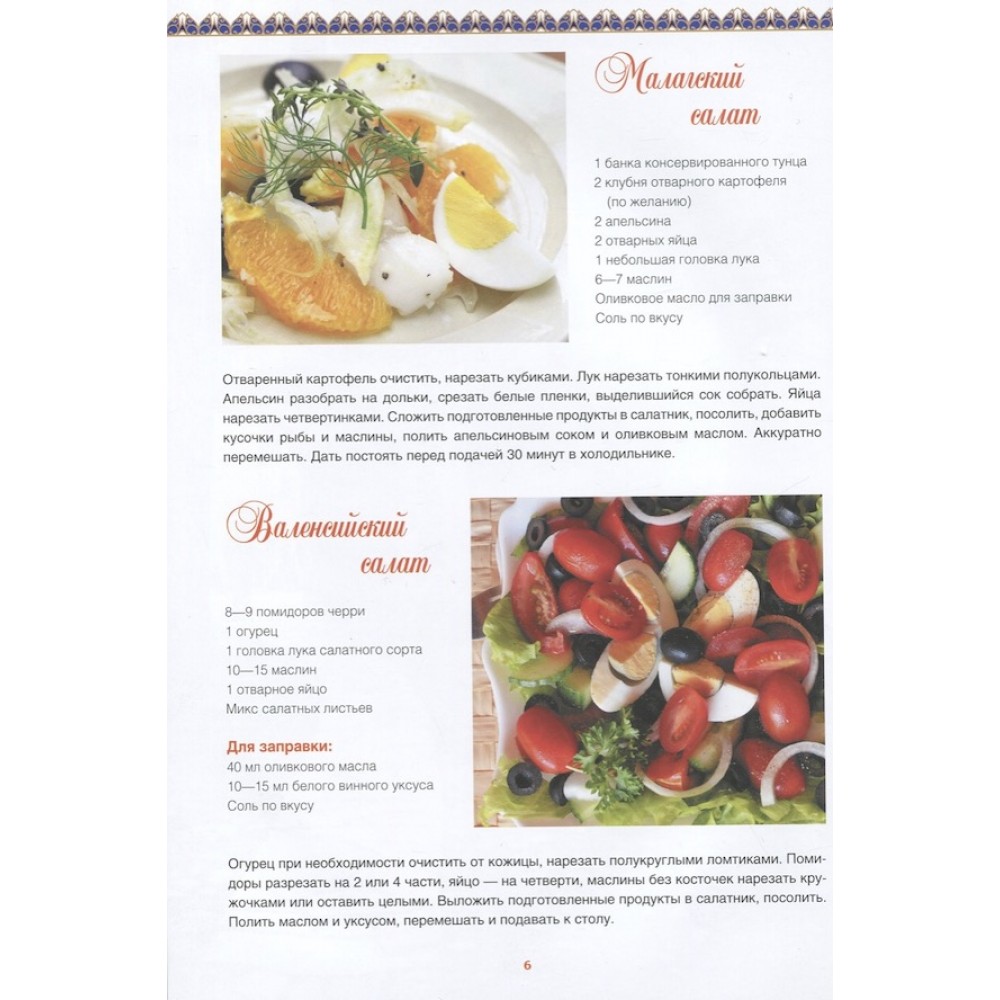Легкий салат з помідорів з горіхами і козячим сиром, пікантні мариновані анчоуси, картопляна тортилья, запіканка з баклажанів по-мурсійськи, ніжний рисовий пудинг, сангрія - кращі рецепти приголомшливих страв іспанської кухні, класичні частування та їхні оригінальні сучасні інтерпретації.