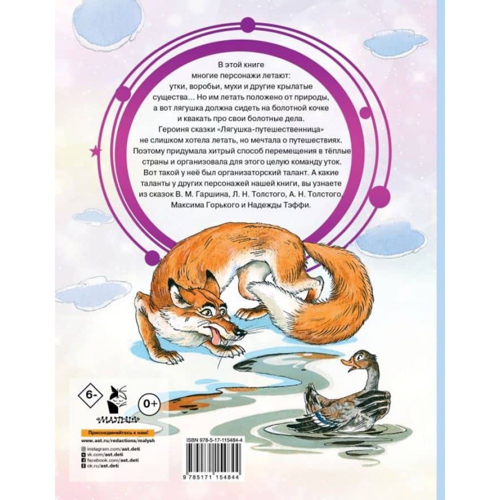 До книжки "Жаба-мандрівниця та інші казки" увійшло вісім зворушливих, веселих і повчальних казок російських письменників В. М. Гаршина, Д. М. Мамина-Сибіряка, Л. М. Толстого, Максима Горького, О. М. Толстого і Надії Теффі. Головні герої цієї книжки - звірі та діти з різними характерами: жаба-мандрівниця - кмітлива, маленький горобець Пудик - неслухняний, дівчинка з казки "Три ведмеді" - допитлива. Але завдяки цим якостям кожен із них переживає свою пригоду і набирається розуму-розуму. Ілюстрації С. Бордюга та Н. Трепенок, Ю. Молоканова, М. Устинова та інших дитячих художників. Для дошкільного віку.