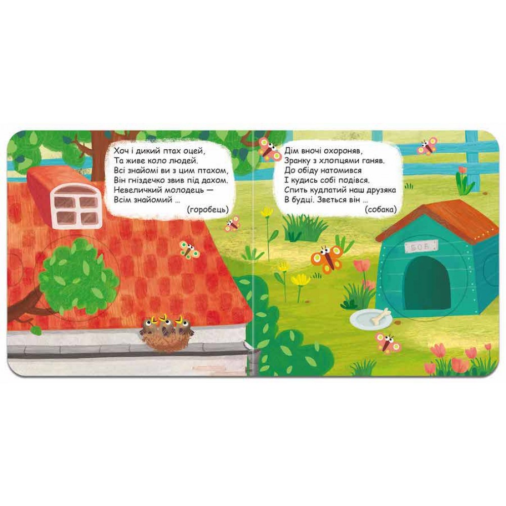 На кожній сторінці цієї розміщено віршик-загадку. Для того, щоб побачити відгадку, дитині потрібно витягнути додатковий елемент у спеціальному отворі збоку сторінки. Відгадка є також і в кінці кожного віршика в дужках. Яскраві малюнки створила талановита художниця Інна Черняк.