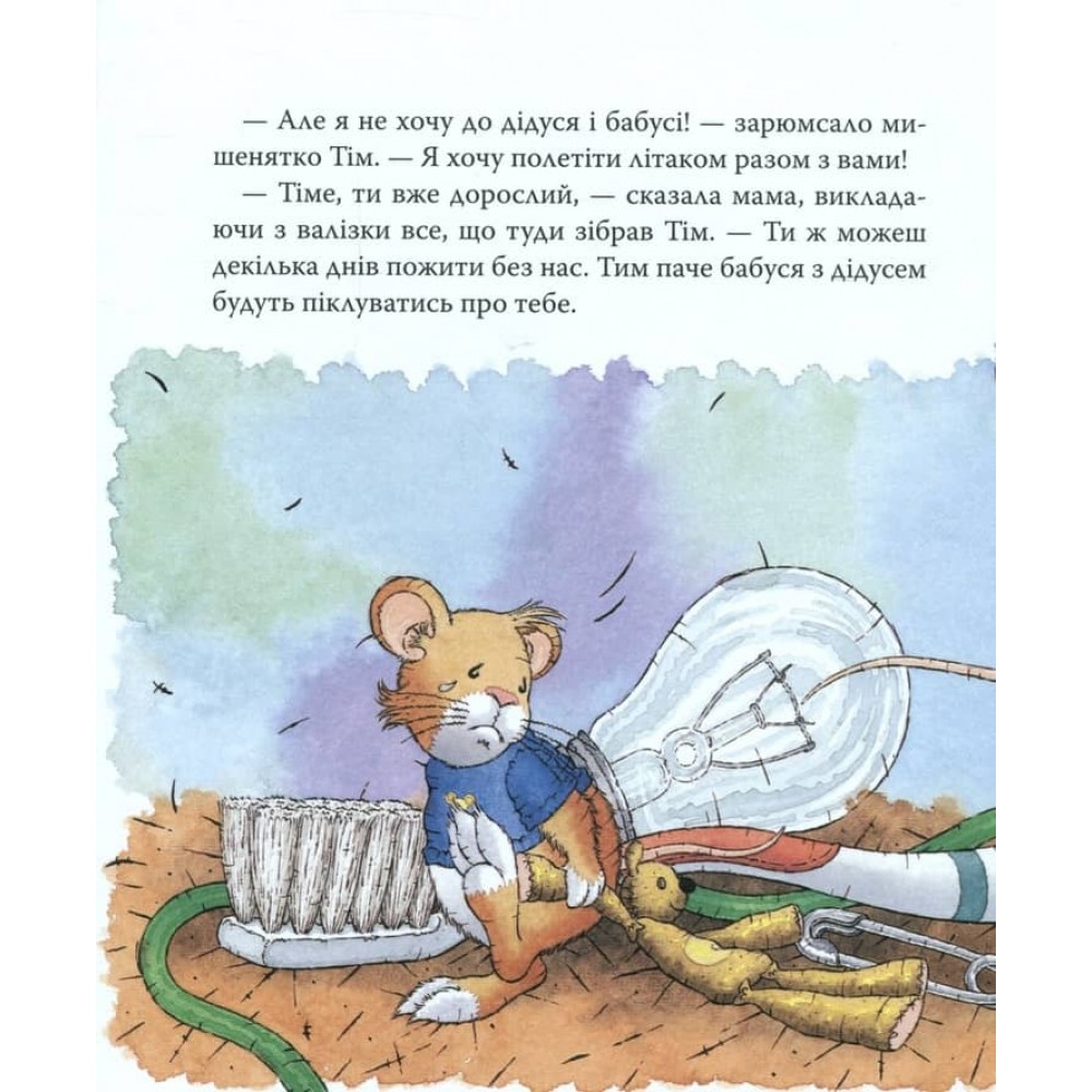 Серія книг про кумедного і милого мишенятка Тіма допоможе малюкам розуміти, визнавати й називати свої почуття, навчитися спілкуватися з однолітками і вирішувати складні ситуації. Мама і тато на кілька днів їдуть, а мишеня Тім повинен пожити у бабусі з дідусем. Тім не хоче. Йому здається, що там не буде нічого цікавого. Але звичайно, це не так. І бабуся з дідусем неодмінно придумають, чим зайняти онука.