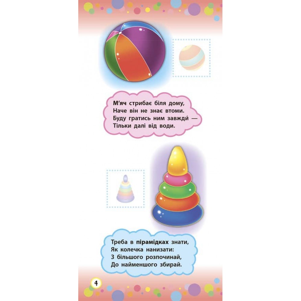 Ця книжка у веселій і цікавій формі познайомить ваших дітей з іграшками й транспортом. Пізнавальні віршики та яскраві картинки допоможуть малюкам легко й швидко, а головне — із задоволенням вивчити назви транспортних засобів й іграшок, а також розвинути зорове сприйняття, уяву та пам’ять. Робота з наліпками неодмінно приверне увагу малюка, урізноманітнить процес навчання та не дозволить нудьгувати. Перетворіть дозвілля дитини на цікаву гру!