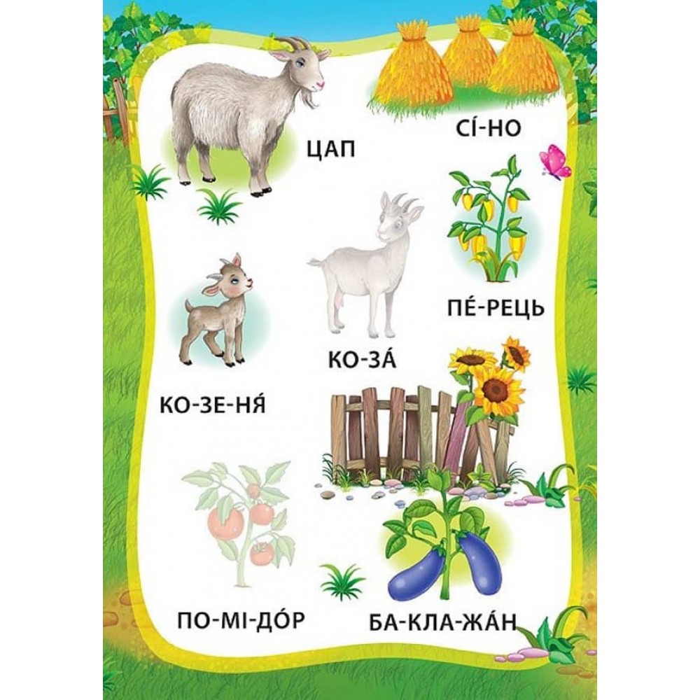 Ця книжка допоможе малюкам навчитися читати по складах і запам’ятати назви свійських тварин та рослин, що ростуть на подвір’ї та городі, розвинути дрібну моторику пальців рук, зорову пам’ять й увагу. Видання містить яскраві ілюстрації, тематичні наліпки й підписи до кожного малюнка. Крім того, слова поділені на склади та надруковані зручними для сприйняття великими літерами. Усе це зробить складний процес читання легким і захопливим.