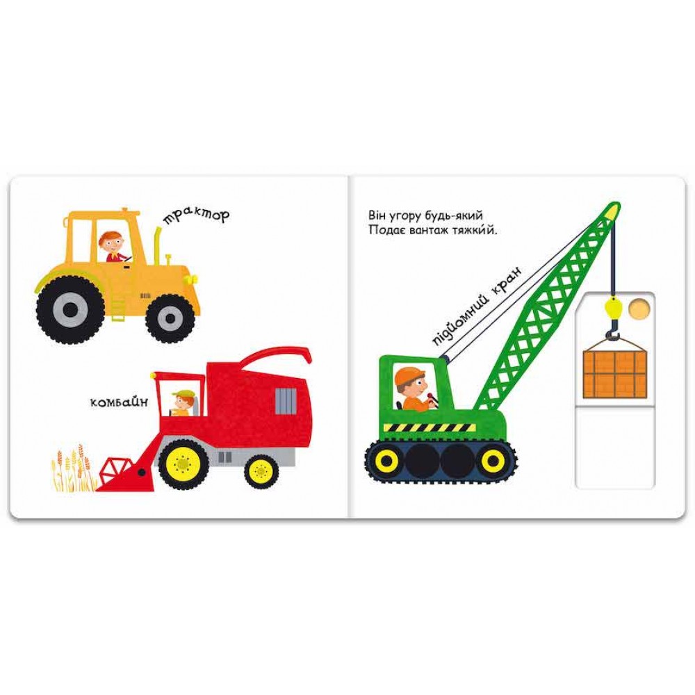 Окрім загадок та відгадок на них, схованих у додаткових елементах, рухомі частини дозволять дитині зрозуміти, яким чином працює підйомний кран, бульдозер та пожежна машина.