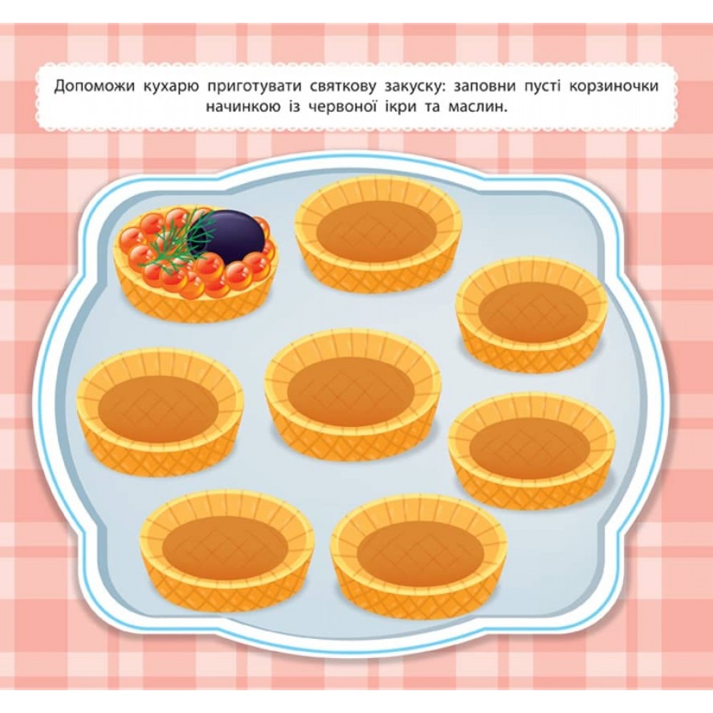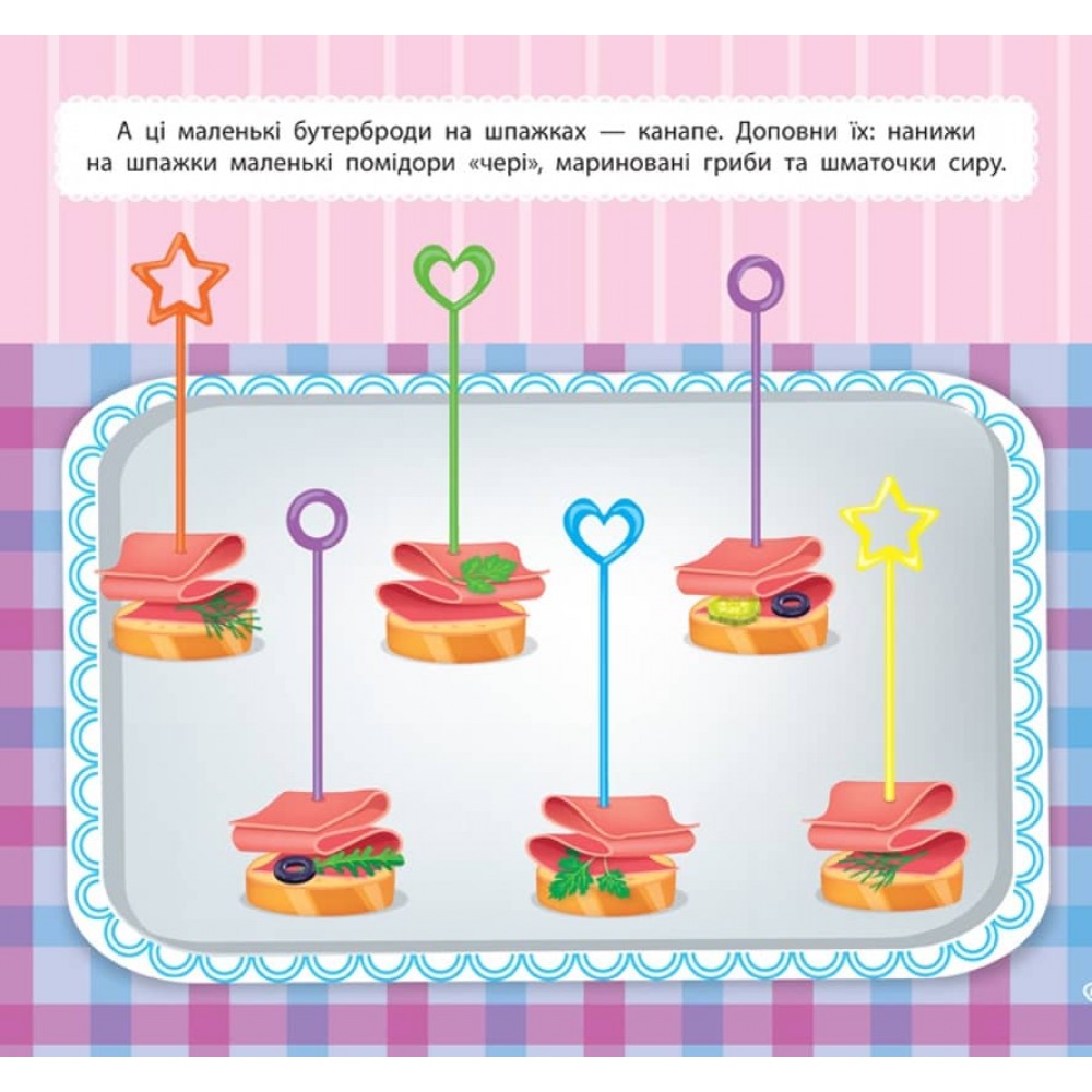 Ця книга дозволить дитині за допомогою наліпок прикрасити або приготувати різні святкові страви, десерти й напої. Видання містить великі тематичні ілюстрації страв і безліч наліпок для їхнього декорування. Книга сприятиме розвитку фантазії, творчих здібностей, логічного мислення, мовлення, уваги та дрібної моторики пальців рук.