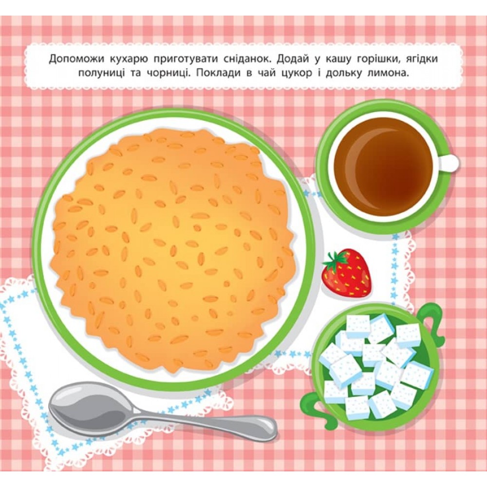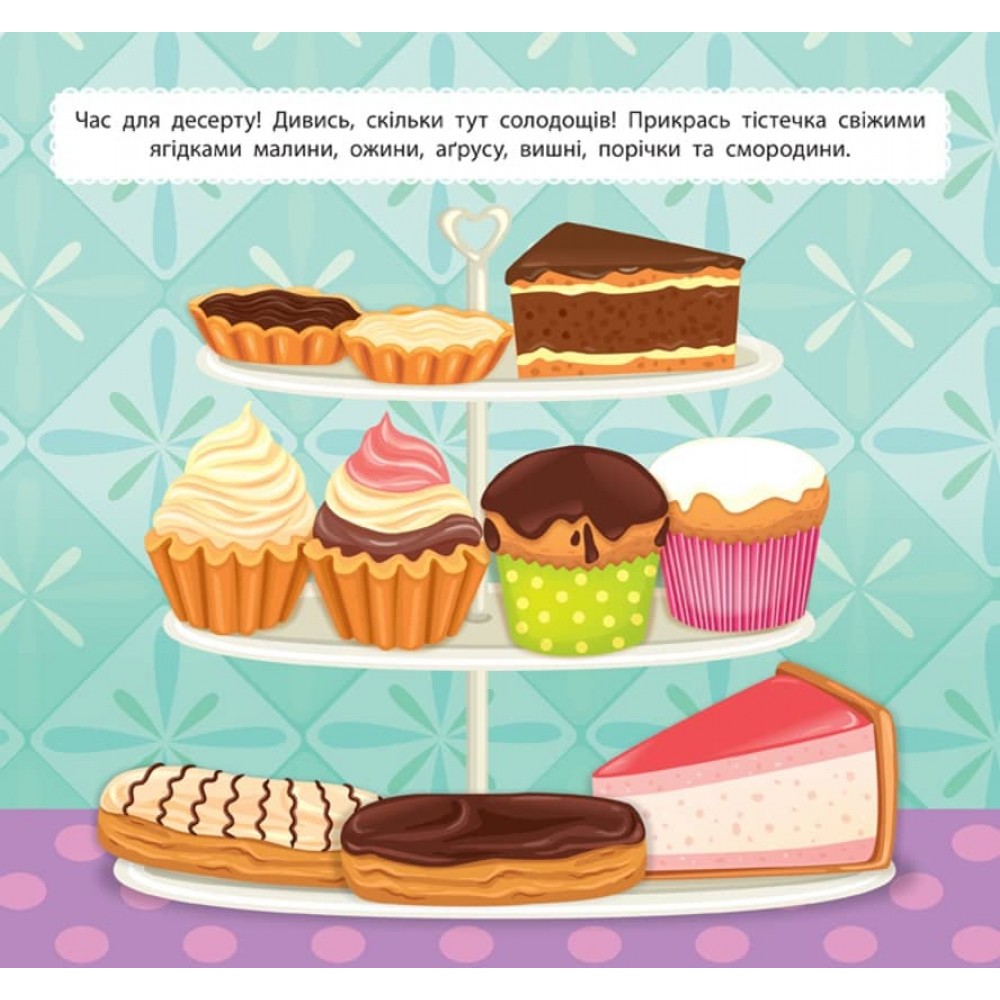 Ця книга дозволить дитині відвідати кафе й за допомогою наліпок прикрасити або приготувати різні страви, десерти й напої. Видання містить великі тематичні ілюстрації страв і безліч наліпок для їхнього декорування. Книга сприятиме розвитку фантазії, творчих здібностей, логічного мислення, мовлення, уваги та дрібної моторики пальців рук.