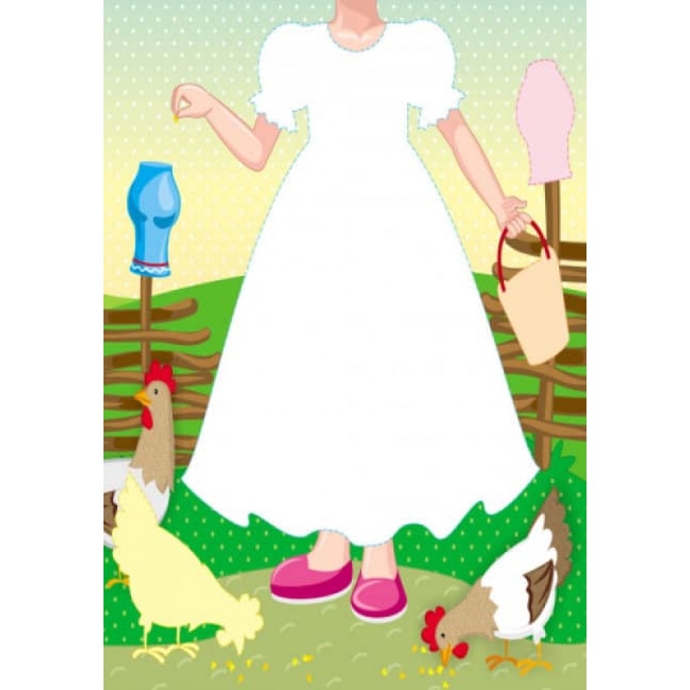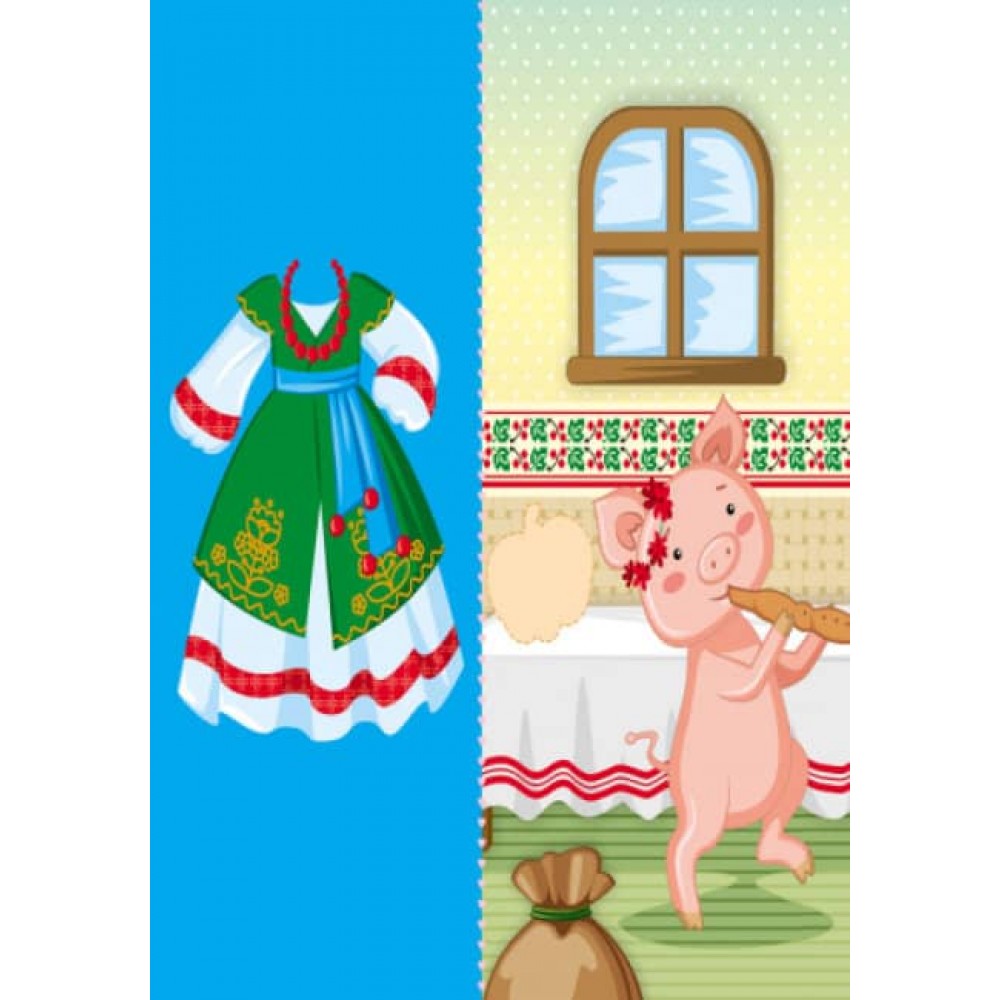 Обкладинка кожної книги має оригінальну вирубку у вигляді дівчинки-ляльки. А сторінки книги - це її вбрання. За допомогою кольорових олівців, фломастерів та доданих до книги наліпок дитина зможе розмалювати наряди для ляльки. Зразки суконь дані поруч на сторінці.