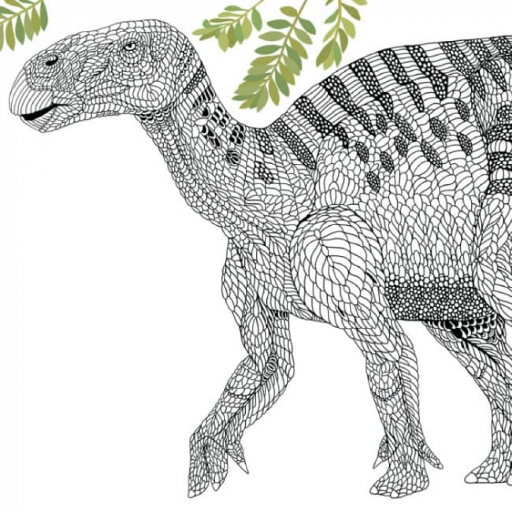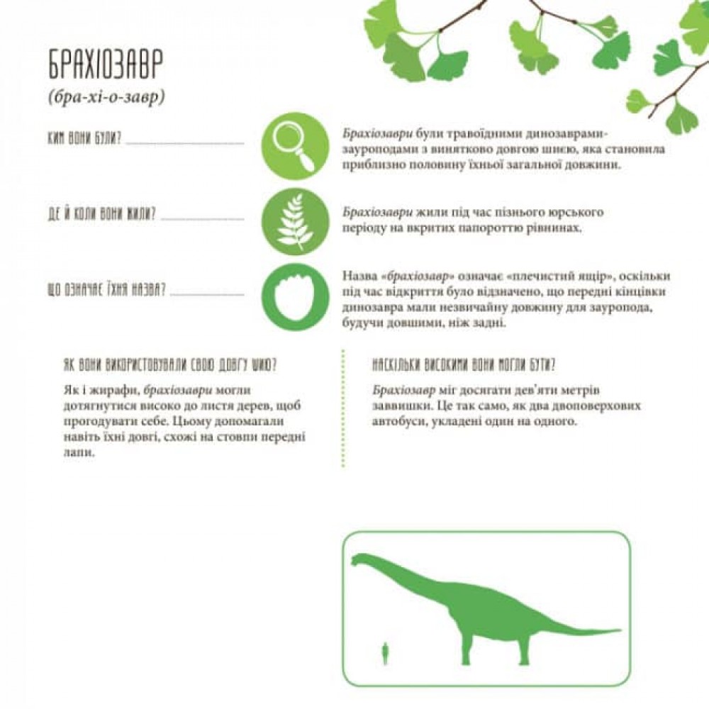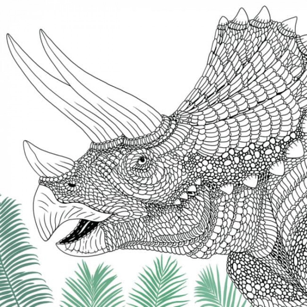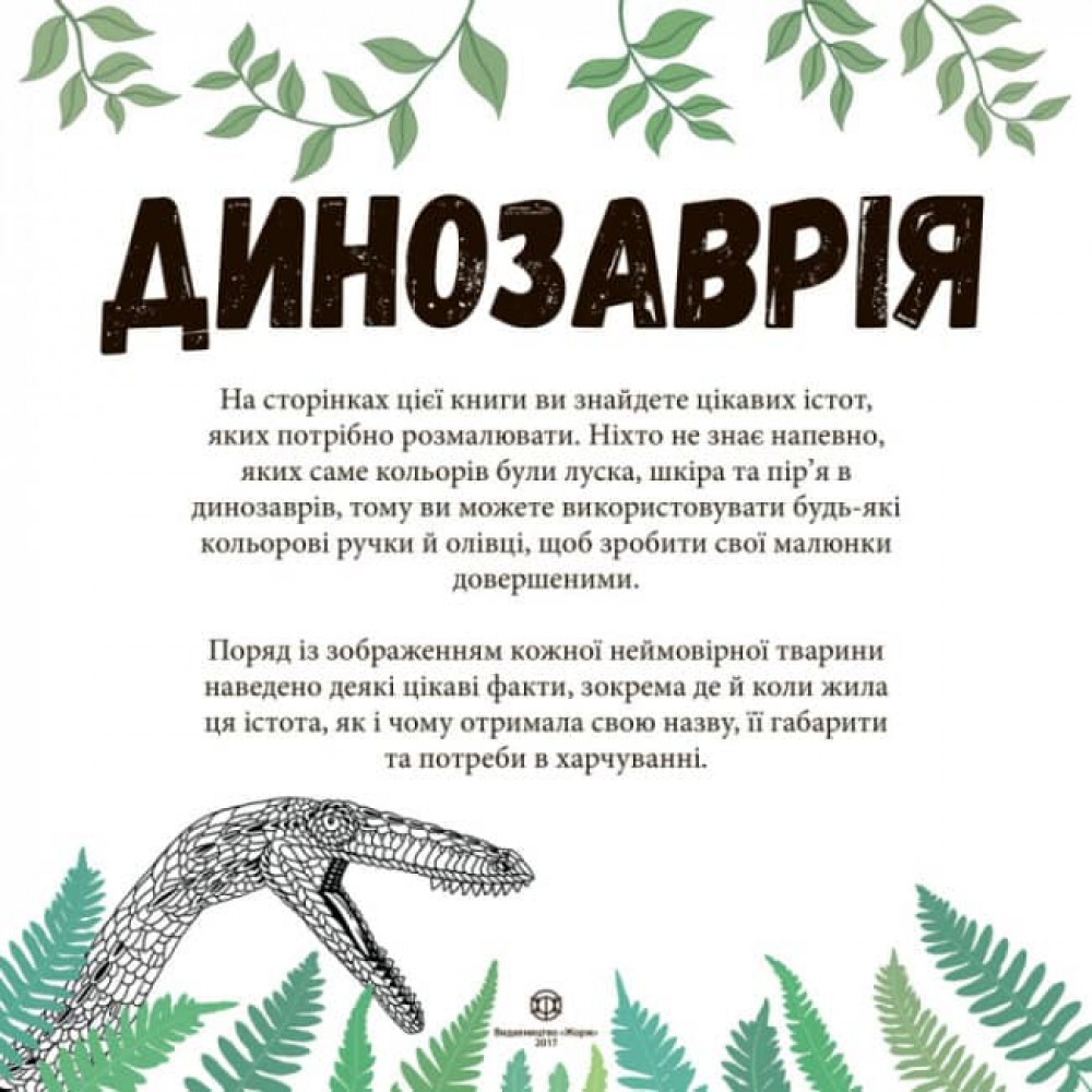 Розмальовки та цікаві факти про динозаврів. Поряд із зображенням кожної неймовірної тварини наведено деякі цікаві факти, зокрема де й коли жила ця істота, як і чому отримала свою назву, її габарити та потреби в харчуванні.