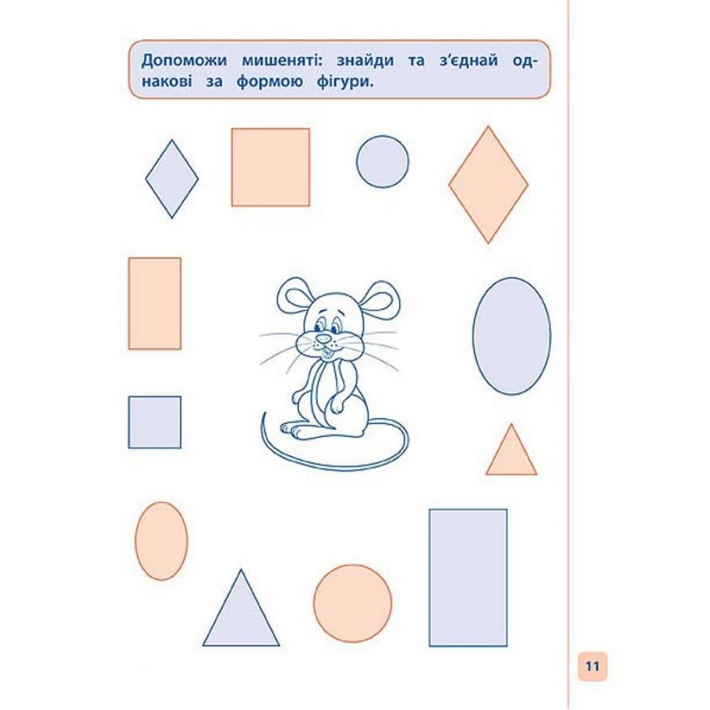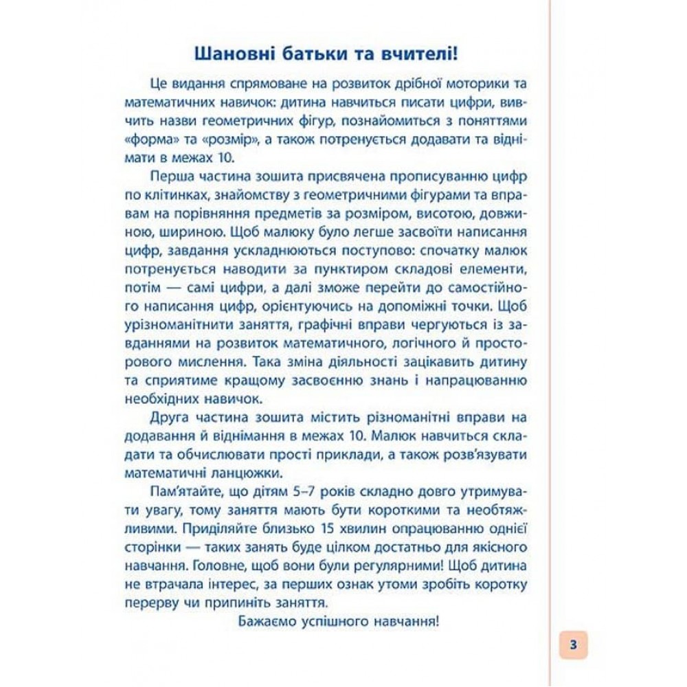 Це видання спрямоване на розвиток дрібної моторики та математичних навичок: дитина навчиться писати цифри, вивчить назви геометричних фігур, познайомиться з поняттями «форма» та «розмір», а також потренується додавати та віднімати в межах 10.