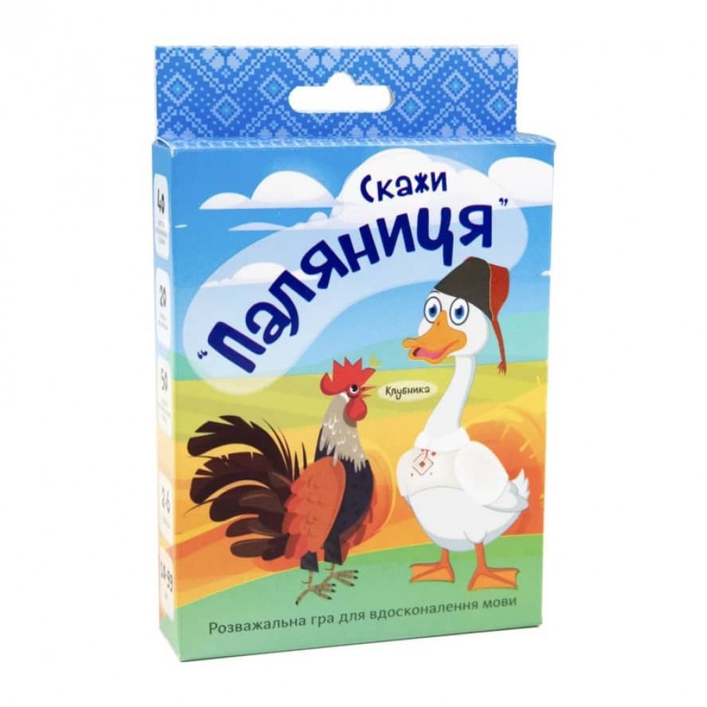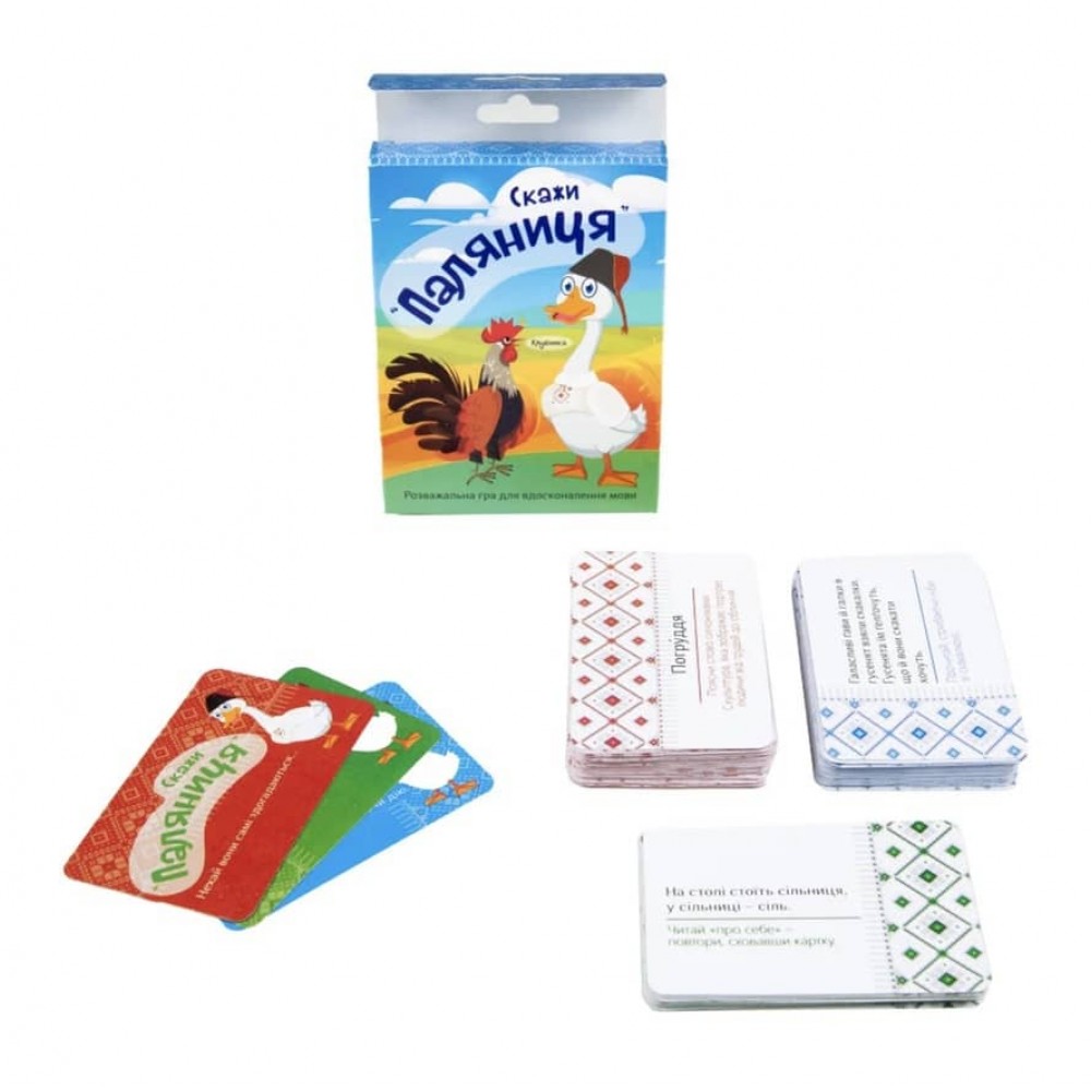 «Скажи "Паляниця"» – гра, яка допоможе натренувати вміння правильно та чітко вимовляти різні звуки і букви української мови. У грі 98 карток, які можна розділити на 3 колоди: зі скоромовками та діями, зі скоромовками для вивчення напам'ять, з українськими маловідомими словами.