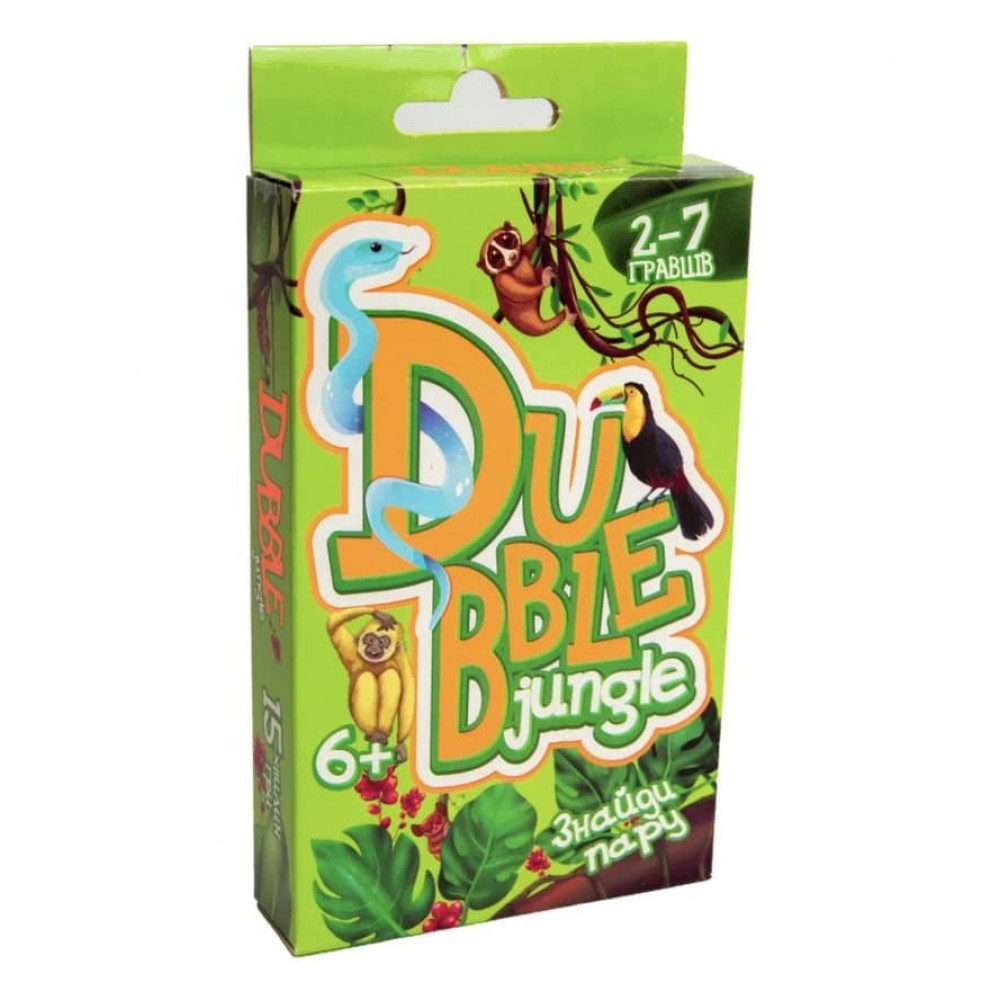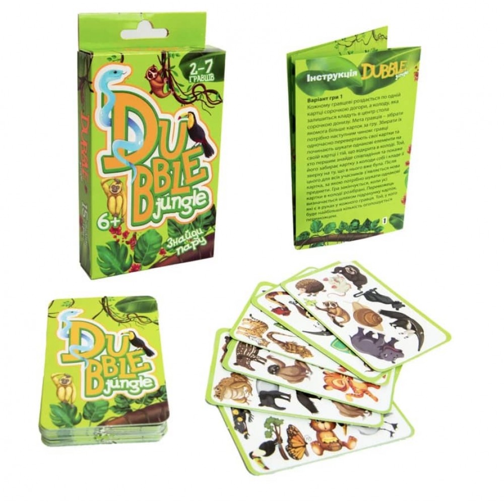 «Dubble jungle» (Дабл Джангл) – активна карткова гра на швидкий пошук збігів. Дітям необхідно порівнювати свою картку з іншими картками та швидше за інших гравців знаходити однакові малюнки на них. Переможцем стає той, хто збере найбільше карток зі збігами. У цій грі доведеться використати всю свою уважність, спритність і пам'ять. Тому веселе заняття перетвориться на справжнє тренування.
