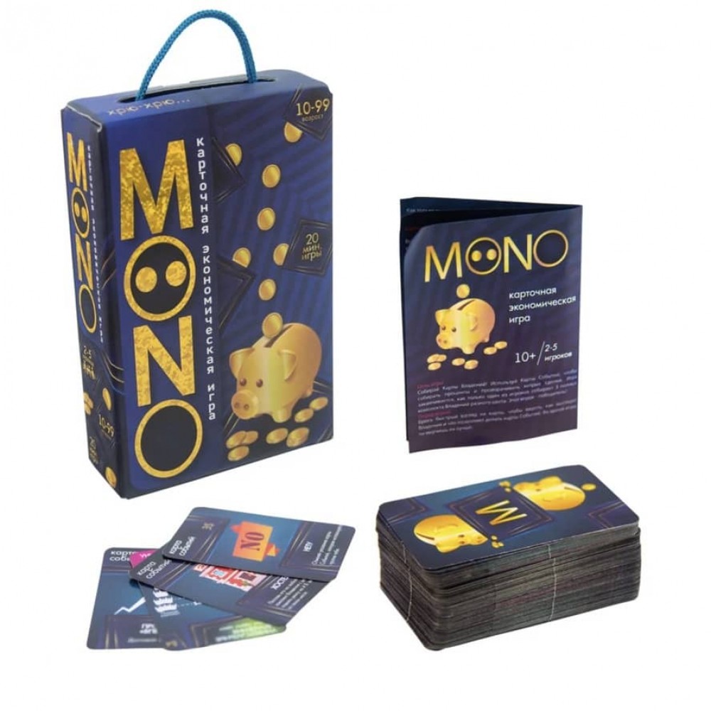 «MONO» (Моно) – карткова економічна гра, за допомогою якої можна влаштувати справжнє змагання між власниками різної власності. Щоб перемогти потрібно зібрати 3 повних комплекти Власності різного кольору. Для досягнення головної мети дотримуйтесь правил і використовуйте карти Дій, які підкинуть багато сюрпризів. На вас чекають хитрі угоди і приємні бонуси, а також шахраї і оплата заборгованостей.