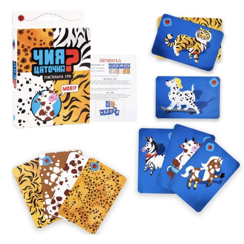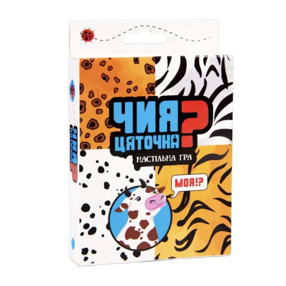 «Чия цяточка?» – сімейна гра з яскравими малюнками на картках. У грі 54 картки, з яких 24 шт. – з тваринами та отвором посередині, а 30 шт. – з візерунками. Гравці отримують в руки по 6 карток з тваринами, а картки з візерунками добре перемішують і кладуть в стопку сорочкою догори. Тепер гравці по черзі відкривають з цієї стопки картки і порівнюють їх з картками в руках. Той, хто першим викладе з рук правильно підібрану картку з твариною, забирає картку з візерунком собі. Гравець з найбільшою кількістю карток перемагає.