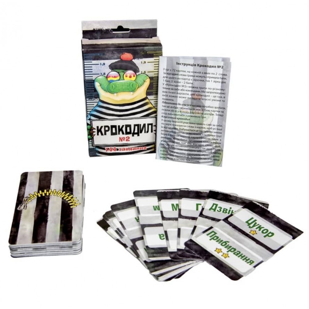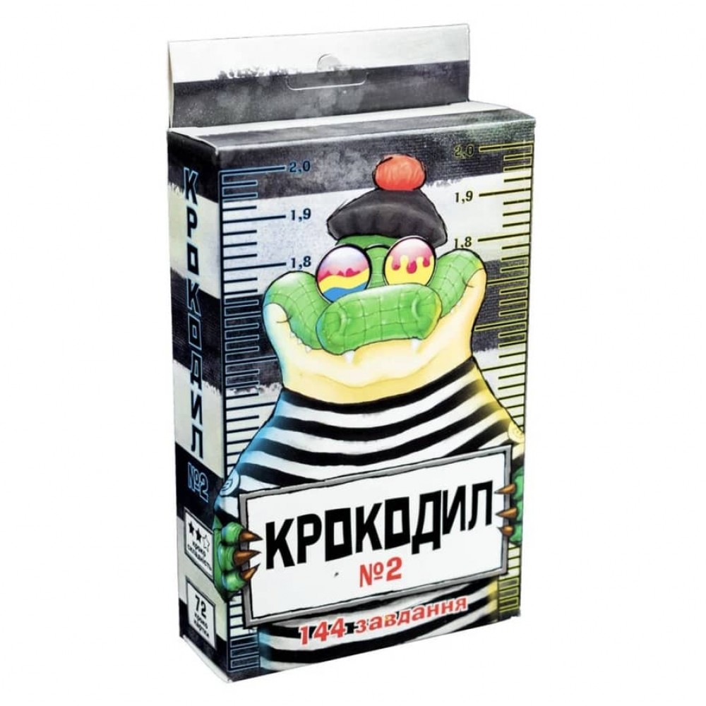 «Крокодил №2» – це всім відома гра з новими завданнями. У ній 72 картки та 144 слова, з яких на ваш вибір слова двох рівнів складності. Грайте невеликою компанією доки в вас не закінчаться картки та можете починати заново.