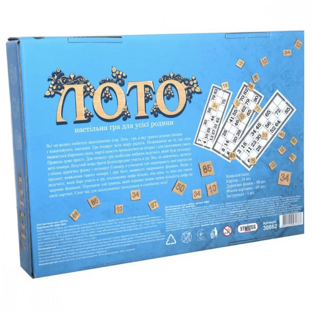 Гра «Лото з дерев'яними фішками» Strateg (30662) розвиває пам'ять та увагу. Замість звичних барил, у цьому лото використовуються дерев'яні фішки з нанесеними номерами.