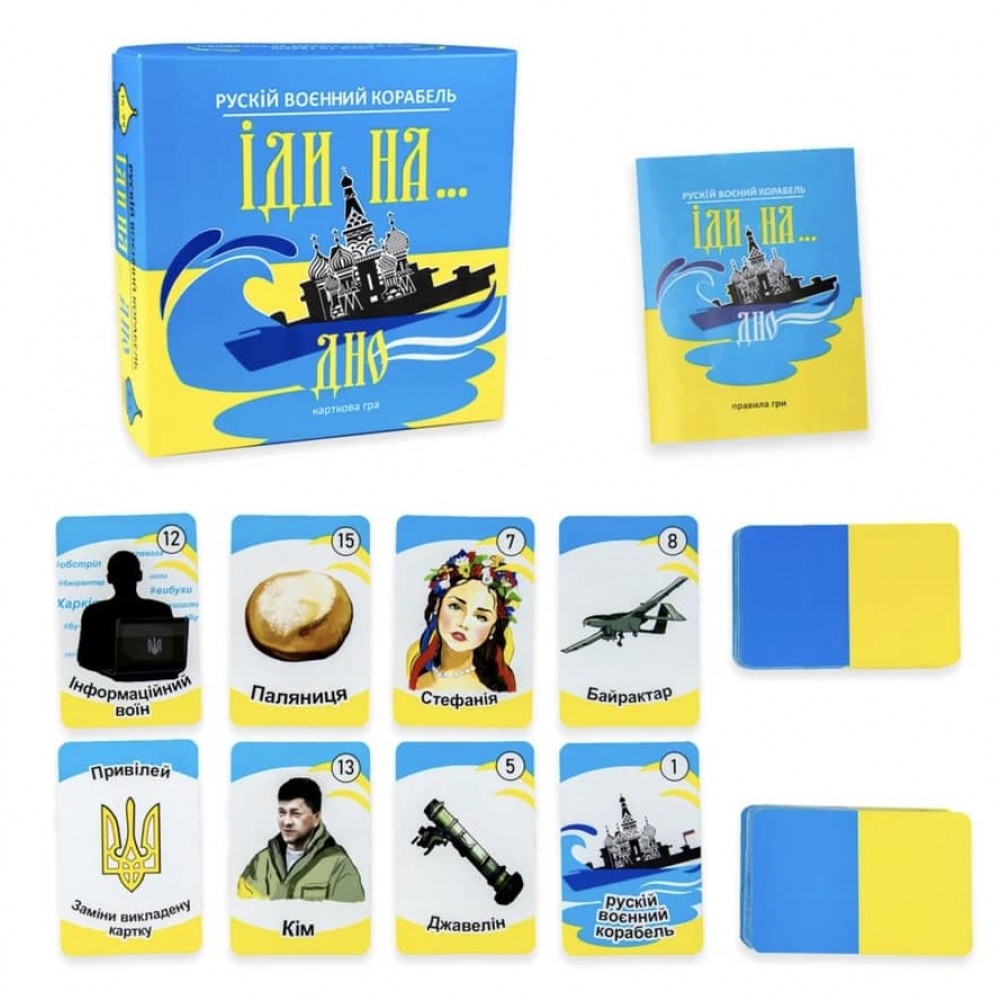 Сумнозвісний корабель вже давно пішов на дно, але згадувати про нього хочеться знову і знову. Адже це історія ніби з легенд, в яких побажання сміливого воїна «Рускій воєнний корабель іди на… дно» дуже скоро здійснилося. У цій картковій грі ми пропонуємо знову перебити ворожий корабель і виграти за допомогою Байрактарів, Конотопських відьом, Волонтерів та інших. Для цього знадобиться ваша пам'ять, уважність та компанія друзів. Гра «Рускій воєнний корабель іди на… дно» Strateg (30973) створена патріотами та стане в пригоді на будь-якій вечірці.