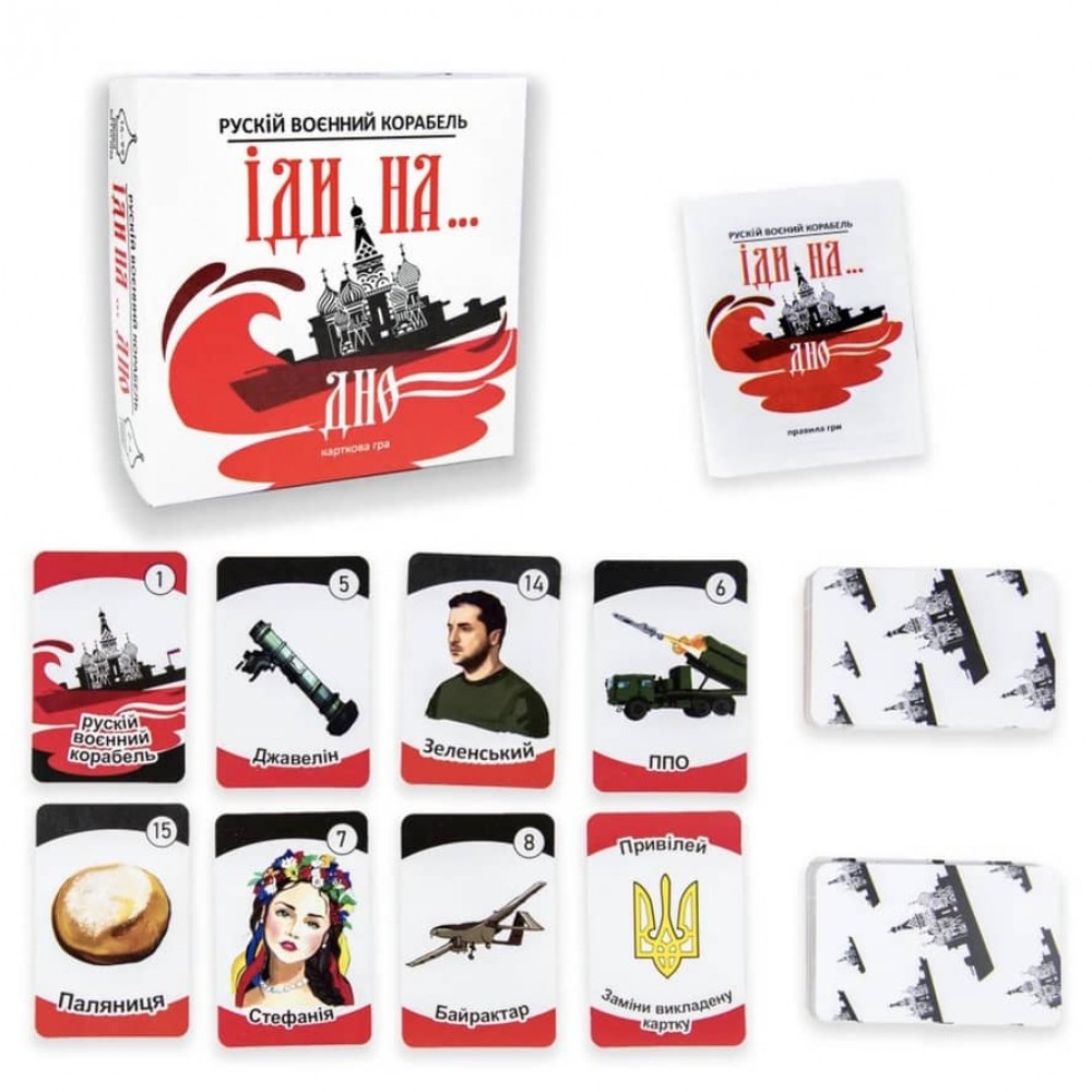 Сумнозвісний корабель вже давно пішов на дно, але згадувати про нього хочеться знову і знову. Адже це історія ніби з легенд, в яких побажання сміливого воїна «Рускій воєнний корабель іди на… дно» дуже скоро здійснилося. У цій картковій грі ми пропонуємо знову перебити ворожий корабель і виграти за допомогою Байрактарів, Конотопських відьом, Волонтерів та інших. Для цього знадобиться ваша пам'ять, уважність та компанія друзів. Гра «Рускій воєнний корабель іди на… дно» Strateg (30972) створена патріотами та стане в пригоді на будь-якій вечірці .